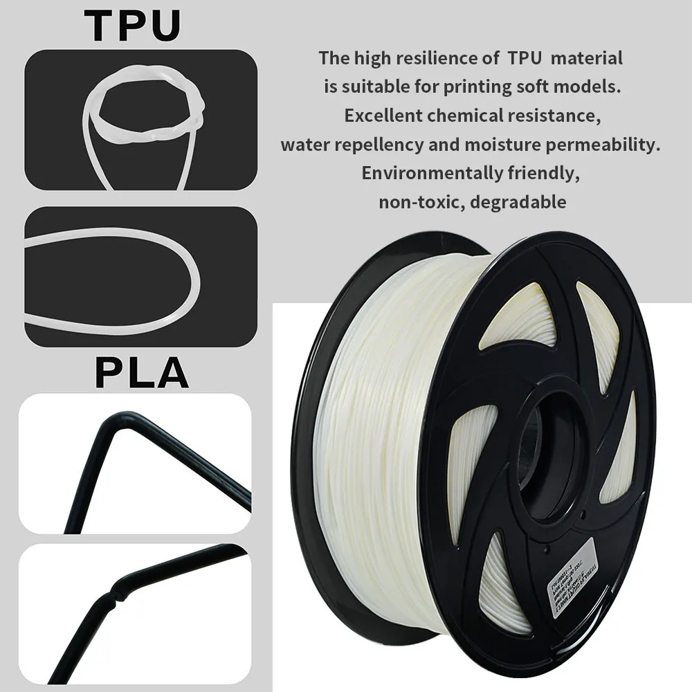 ХарактеристикаЦвет: красный, черный, белый, синий, желтыйВес: 1 кг (около 2,2 фунтов)Диаметр: 1,75 мм (возможна погрешность +/-0,05 мм)Рекомендуемая температура экструзии/сопла: 220 °C - 260 °CПузырь: без пузырьковBENIFITТПУ (термопластичный полиуретан) является подклассом термопластиков, который печатает сильные части, которые также являются гибкими.Совместимость со всеми FDM принтеров на рынке, принимающий оплаты через paypal (1,75 мм нити.Включая Prusa I 3, Monoprice makerвыберите, SainSmart xCreality, WanHao & Qidi и другие принтеры RepRap.С надлежащими настройками, ТПУ легко печатать благодаря отличной адгезии кровати и склонности нити не деформироваться.Отлично подходит для различных проектов, таких как стельки для обуви, ремешки для часов, чехлы для телефонов, детали дрона и многое другое!Качество, которому вы можете доверятьВысокая чистота: ТПУ гибкий, форма может быть изменена внешней силой и отскакивает назад, когда сила исчезает.Прочная прочность: Изготовлено по очень жестким допускам и широкому диапазону температур экструдера, высокой твердости, что делает для более гладкой 3d-печати и меньше проблем с соплом экструдера.Высокая совместимость: применяется для различных 3D-принтеров FDM, Makerbot, UP plus, Mendel, Prusa, серий и т. д.Здоровье: Все продукты прошли директиву RoHS, сделанную 100% полимолочной кислотой.Плотность небольшая, при печати большего объема модельная зажигалка, экономичная.