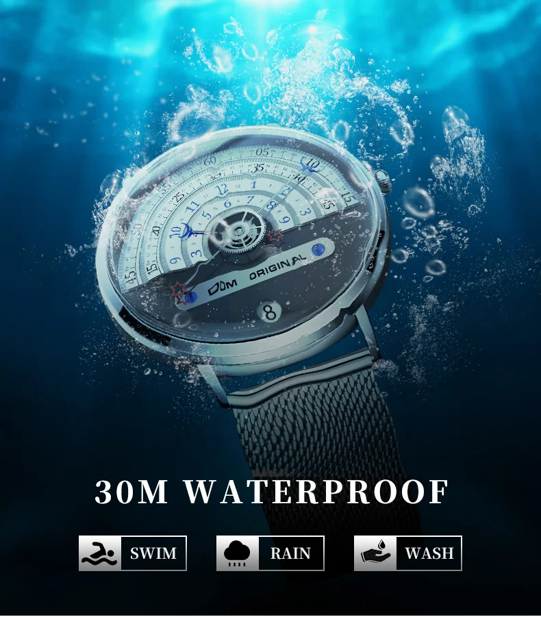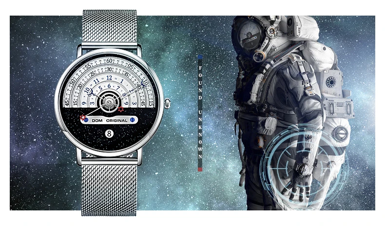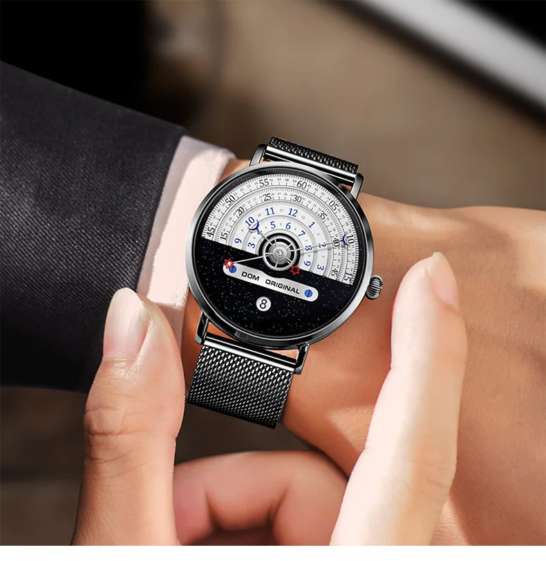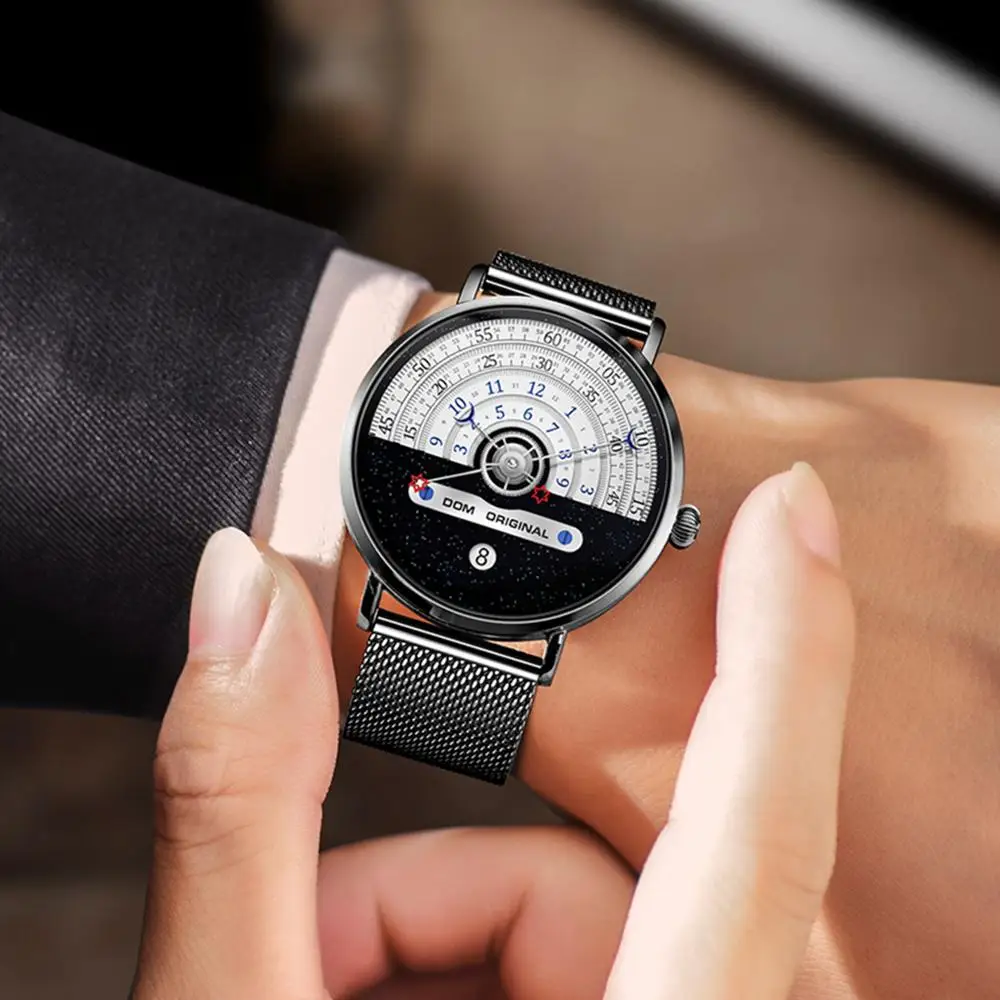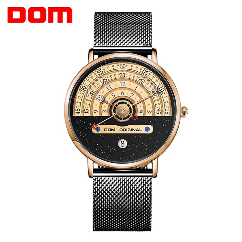 Мужские водонепроницаемые часы от бренда DOM, Уникальные кварцевые наручные часы с Луной, звездой, концептом стрелок, календарем, модной индивидуальностью, мужские Студенческие часы