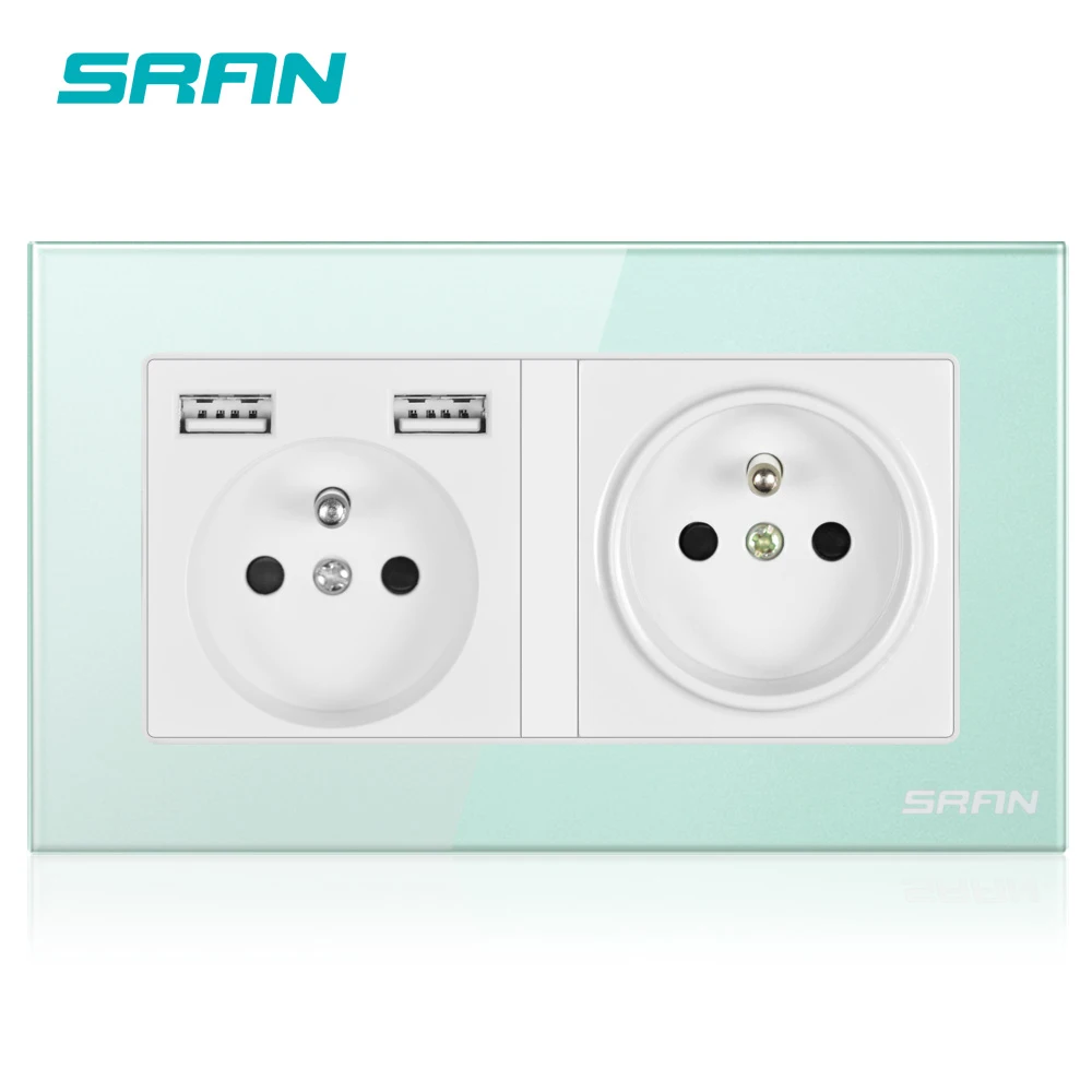 Настенная французская розетка SRAN с заземлением, 16 А, электрическая розетка с выходной полосой usb 146, панель из кристалла, семейный отель