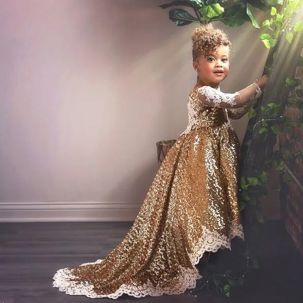 Детское вечернее платье с длинным шлейфом, с длинными рукавами и золотыми блестками