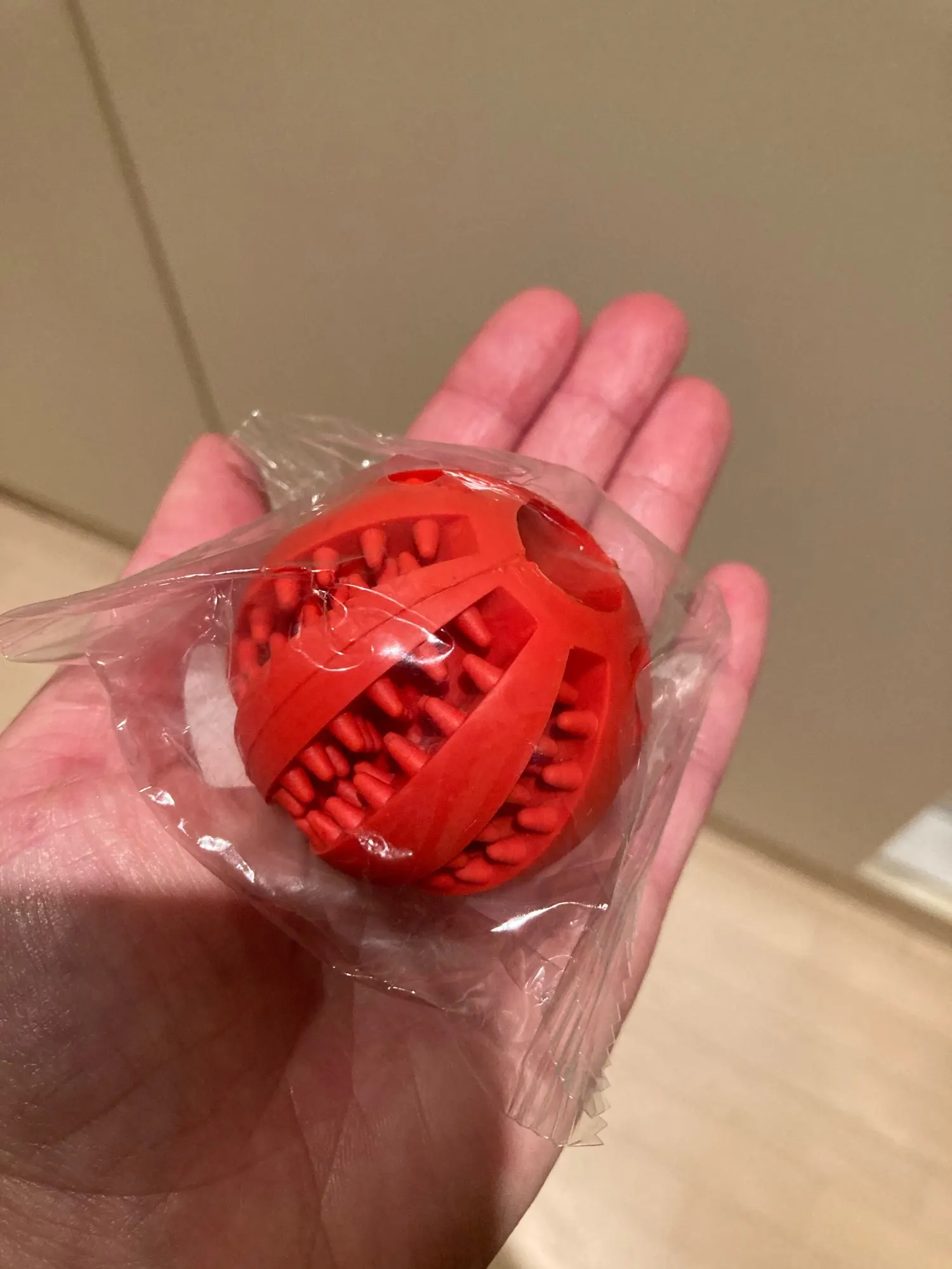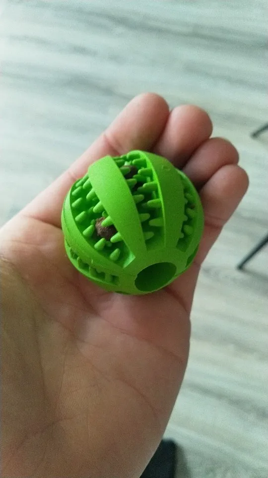 Заказала 1.11, прибыл в СПб 17.11. Ацки пахнет химией. На ощупь резина мягкая. Пальцами везде смогла мячик промыть. Сухой корм легко запихнула, собака с кошкой сразу стали делить игрушку)) только не запихивайте все лакомства глубоко, пару положите так, чтобы собака смогла быстро достать и заинтересоваться.
