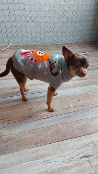 Хороший свитерок,по длине коотенький,ворот плотный,рисунок вживую такой же.Приехал быстро.На моего йорка 1,8кг,худенькийзаказала S,только-только,лучше бы на размер побольше.Продавца рекомендую и спасибо за подарочек-смайлик!