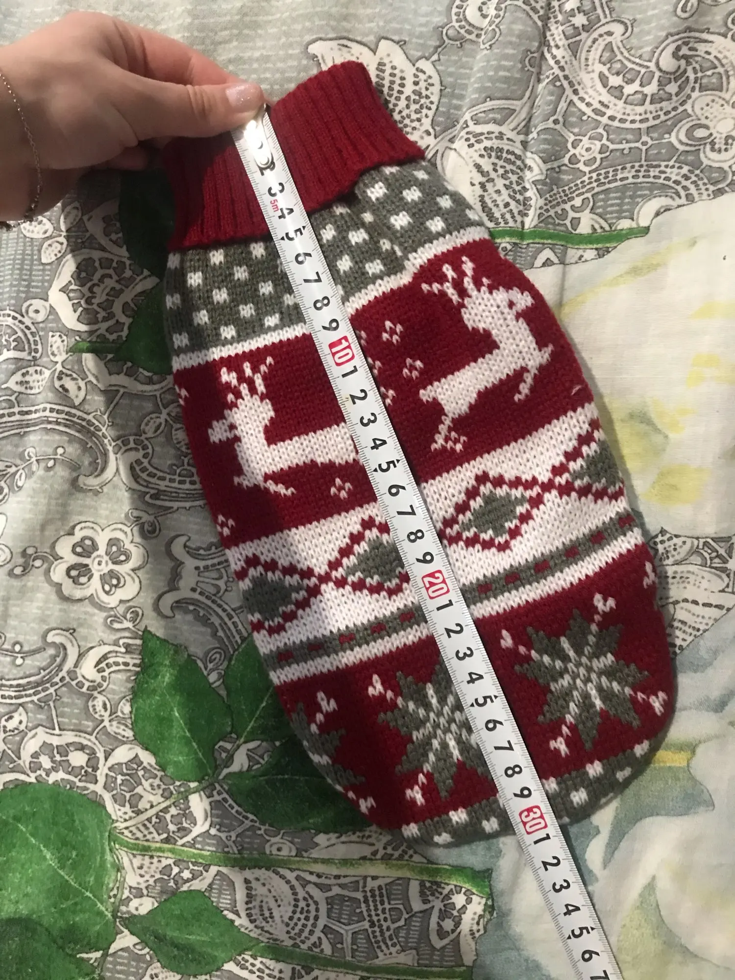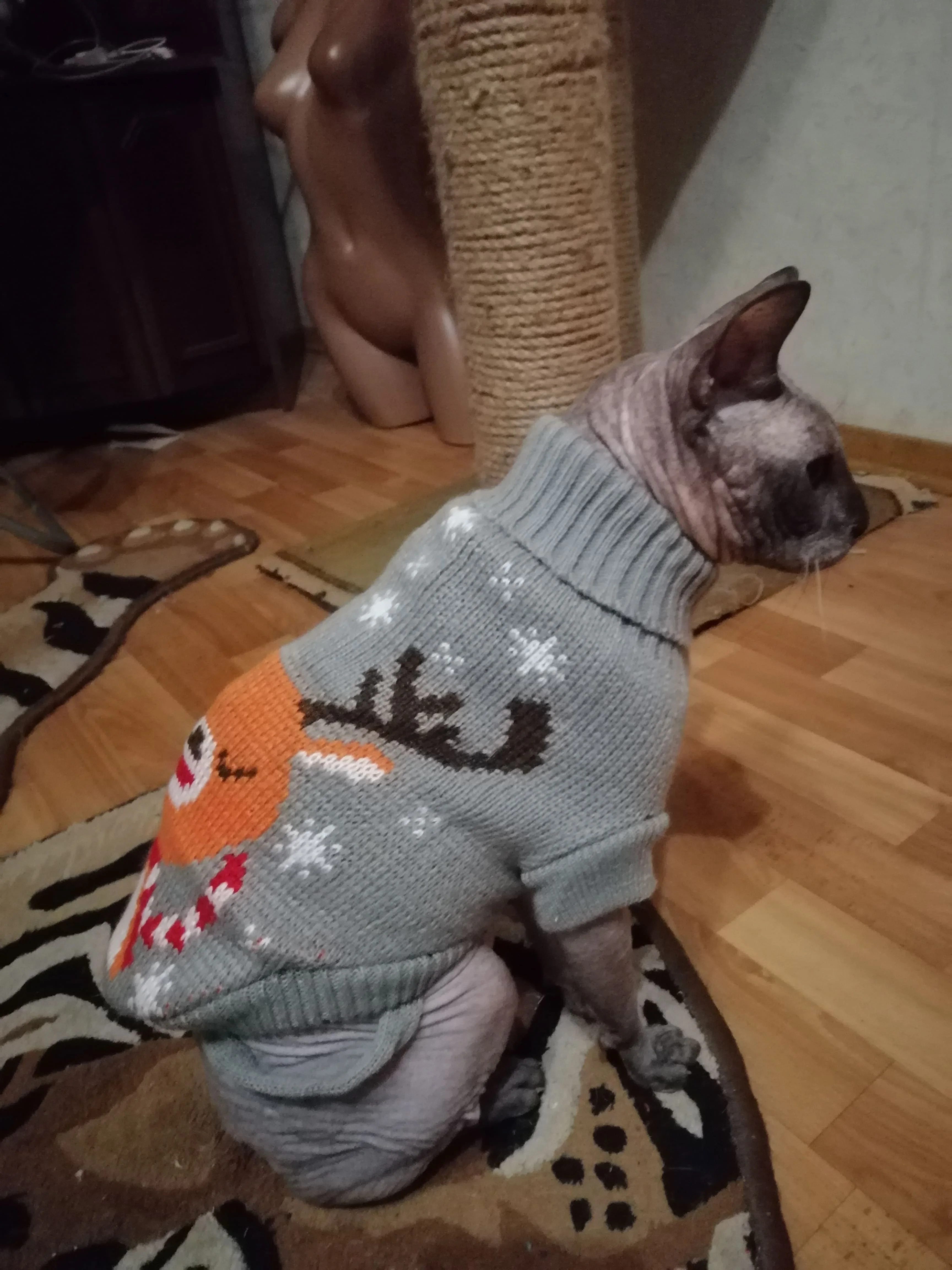 Свитер отличный. Размерной сетке соответствует. На чихе 3,5 кг сел отлично. Одевается легко, на рукавах и горловине вязка мягче, чем на туловище, швы аккуратные, плотная вязка, теплый. На кота маловат, буду заказывать ему больший размер. Сделка прошла успешно. Рекомендую!