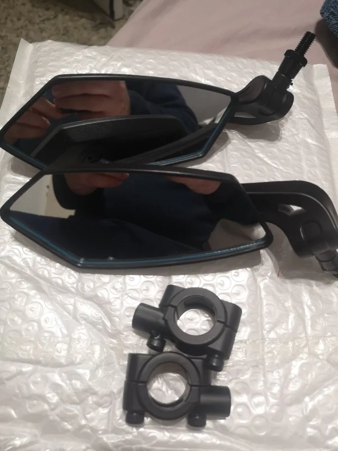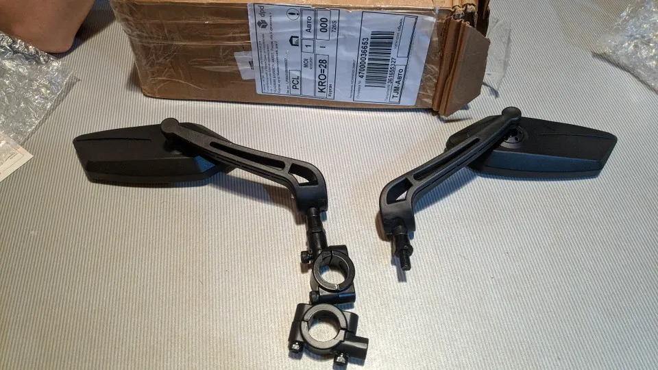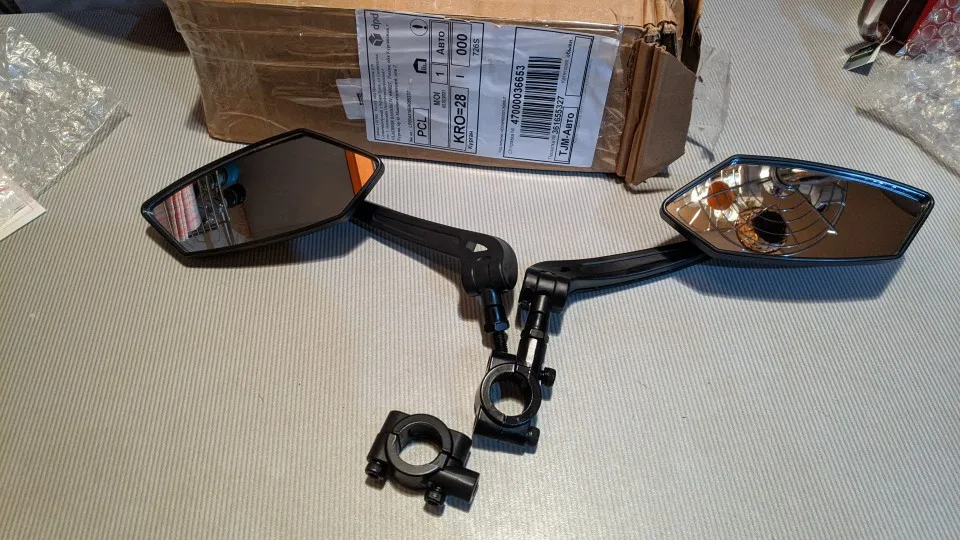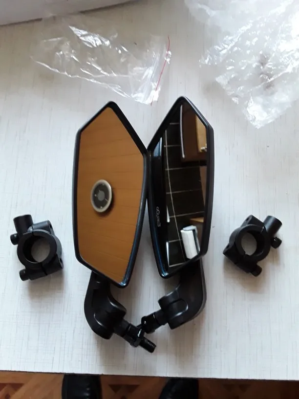 я думал они немного больше. доставка быстрая. упаковано в пупырку и в коробку. пришло всё целое. шарниры тонкие, при падении велосипеда есть шанс сломать, однако зеркала очень туго вращаются, значит не надо будет поправлять после каждой кочки.