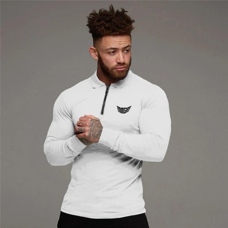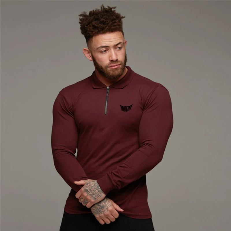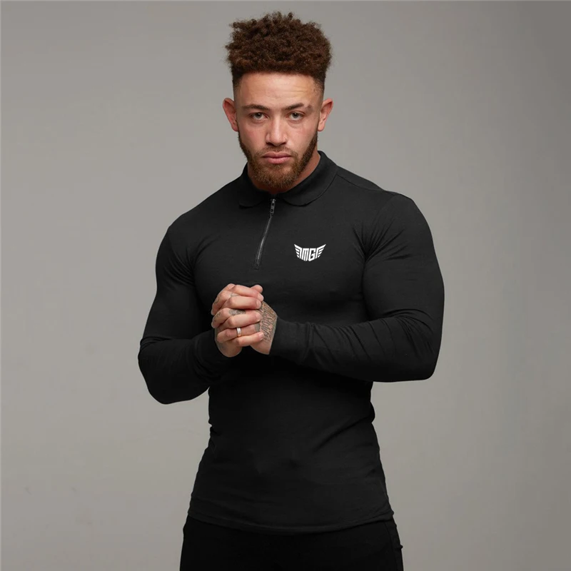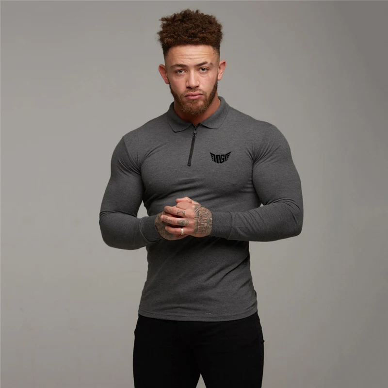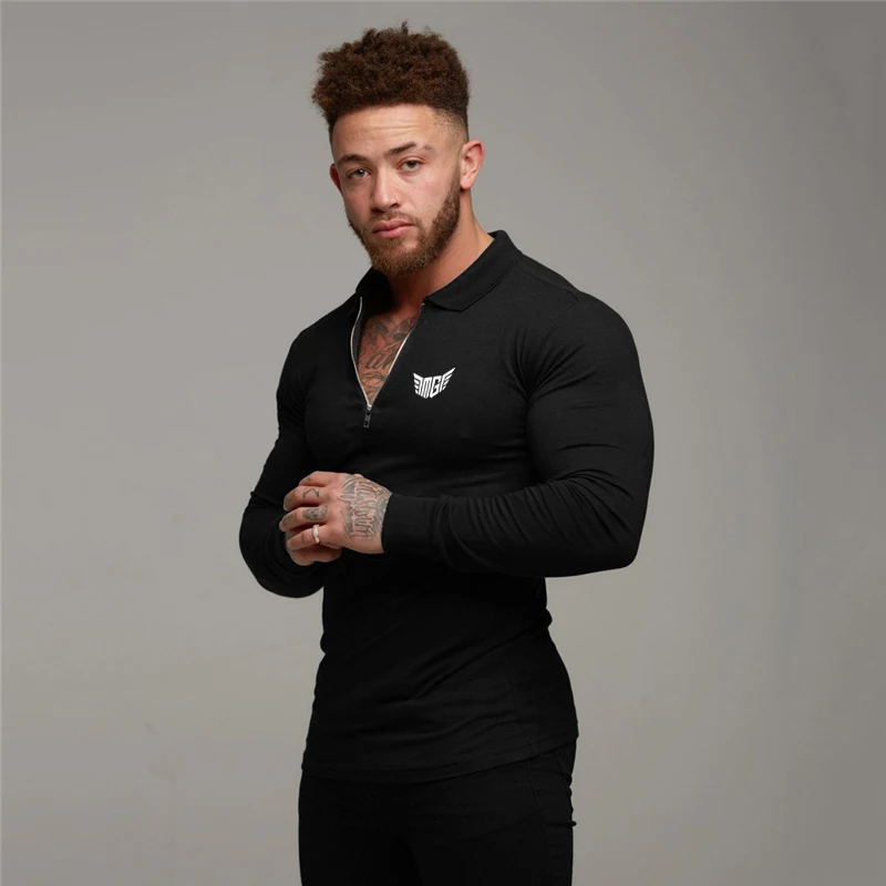 Брендовая мужская рубашка поло для бодибилдинга, спортивная одежда для фитнеса, эластичная хлопковая рубашка поло с длинным рукавом и отложным воротником на молнии размера плюс