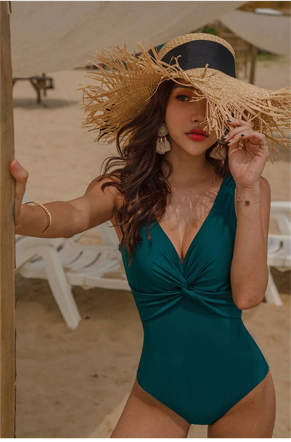 Пикантный цельный купальный костюм с высоким вырезом, Женская однотонная одежда для плавания, Монокини пуш-ап, плиссированный купальный костюм, трикини с открытой спиной, зеленый купальный костюм с бантом