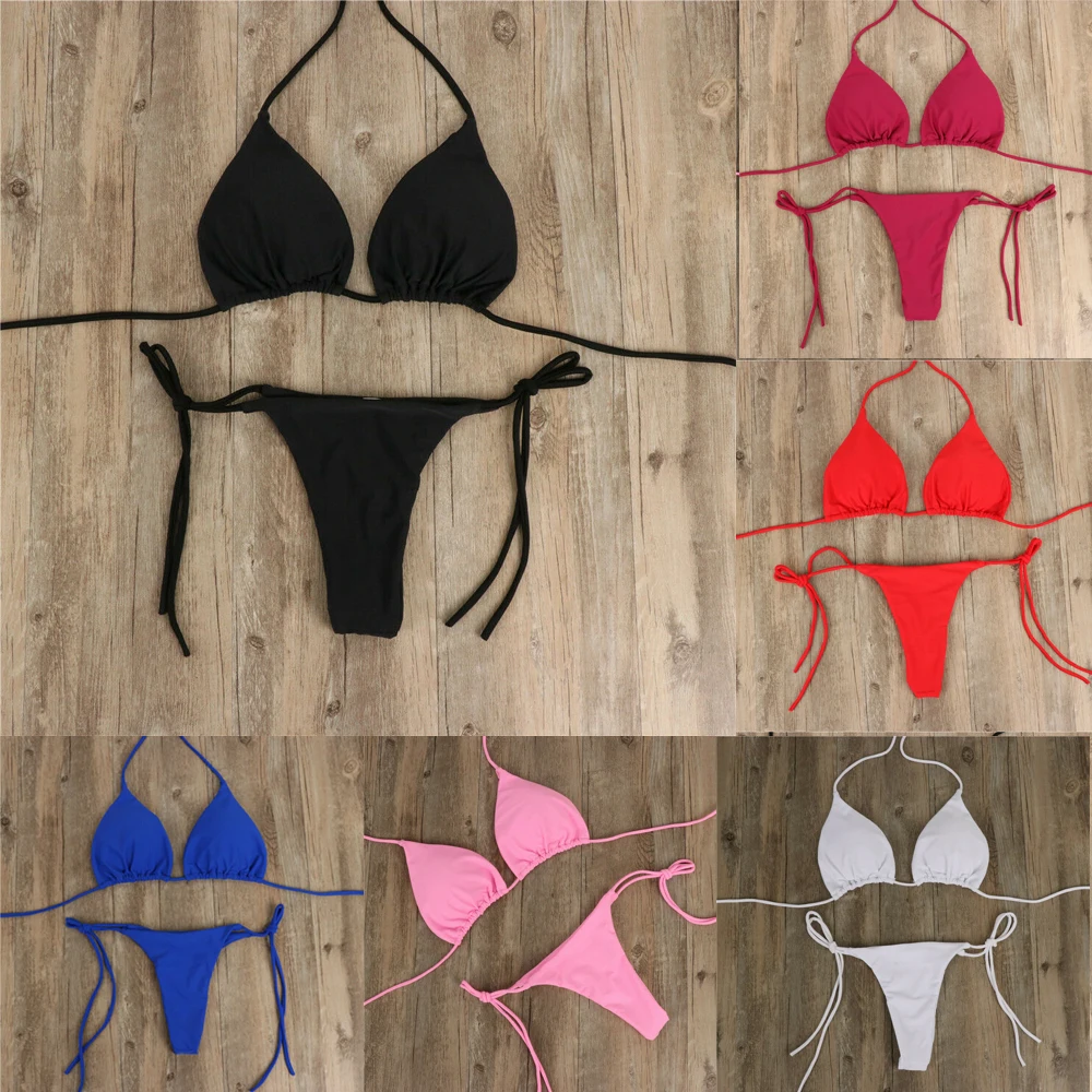 6 цветов, 2 шт. сексуальные женские летние купальники бикини, комплект с бюстгальтером и завязками сбоку, стринги, пляжные треугольные купальники, купальный костюм