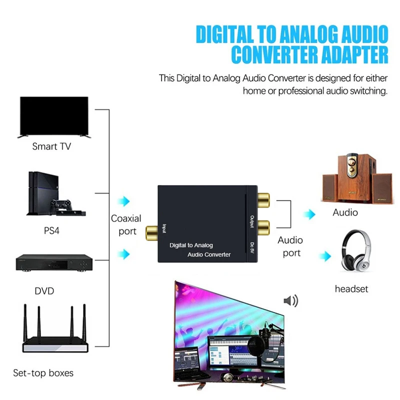 Преобразователь цифрового декодера ЦАП в аналоговый аудио для ТВ-адаптера Jack 2 * RCA-усилителя