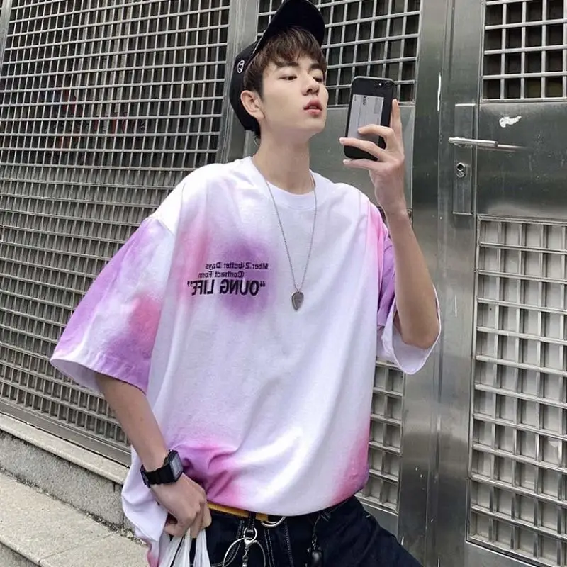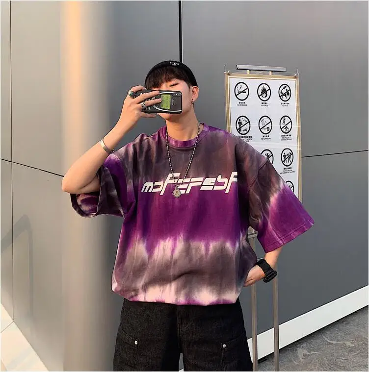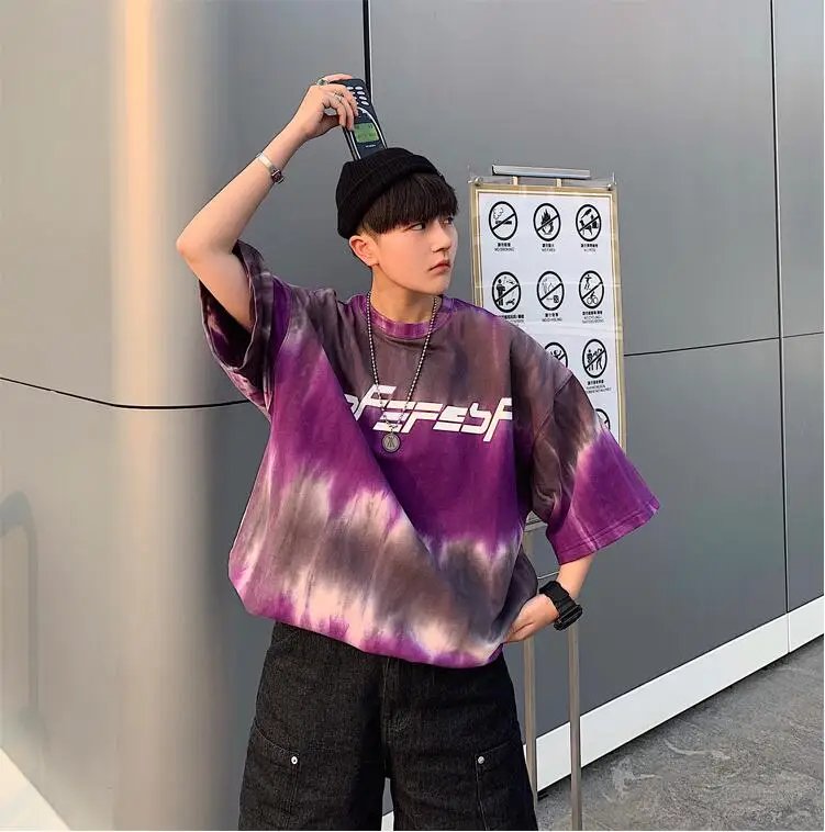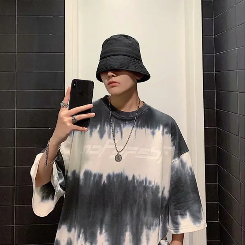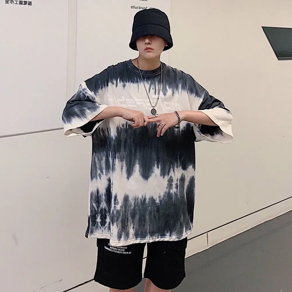 Футболка мужская с коротким рукавом, индивидуальный топ свободного покроя с принтом тай-дай, в Корейском стиле, с пятью рукавами, на лето