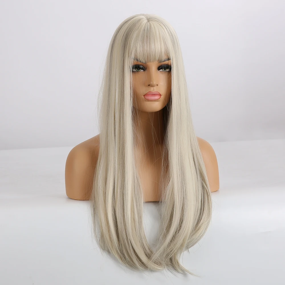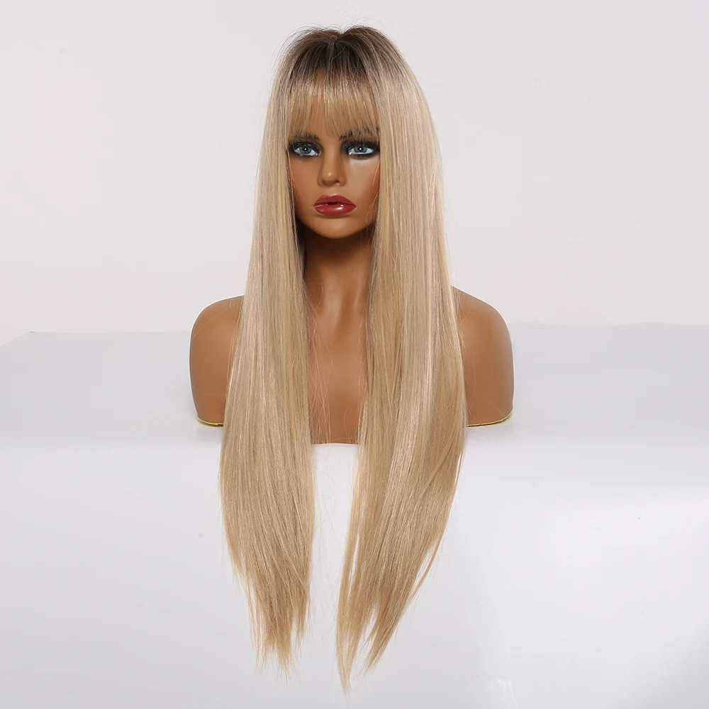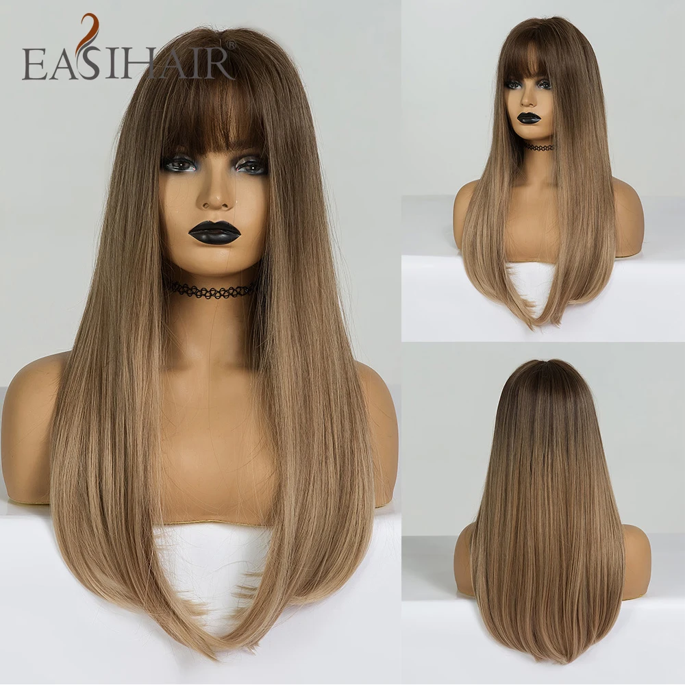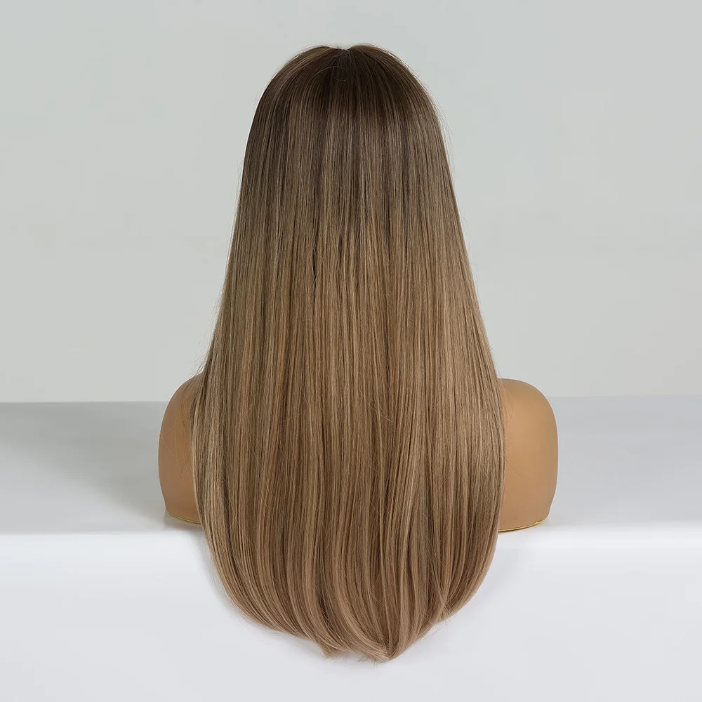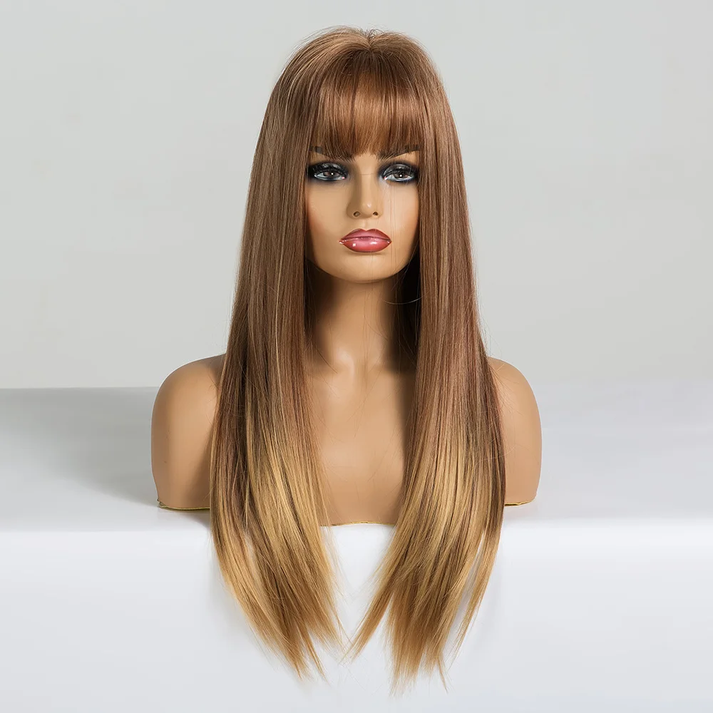 Парики из синтетических длинных прямых волос, цвета коричневого или светлого, с эффектом деграде, с челкой, для женщин, жаропрочные парики высокой плотности