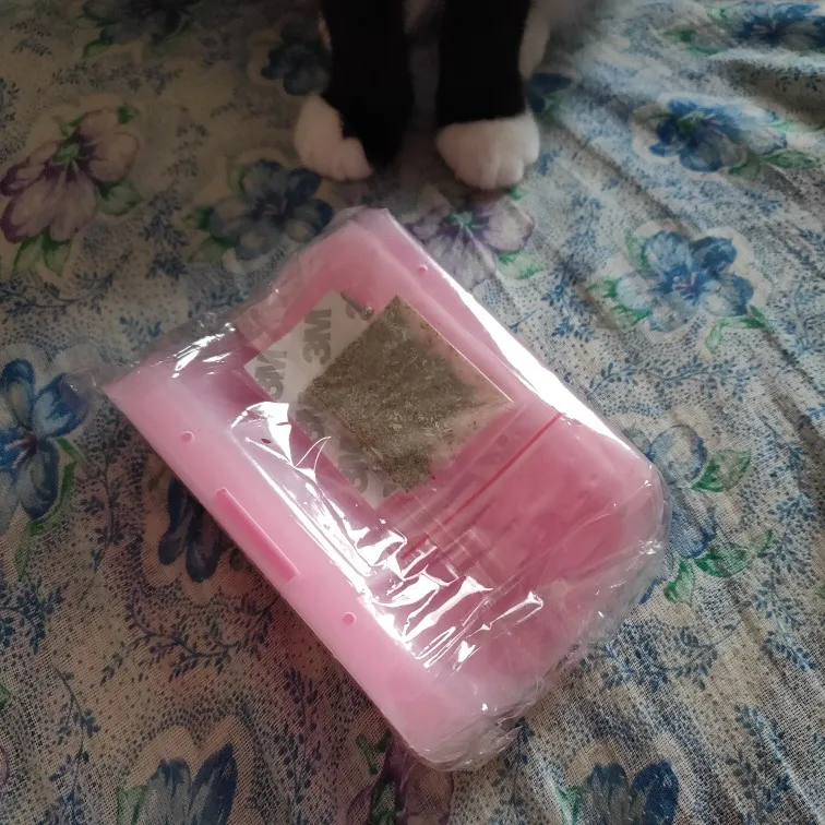 Упаковано было в обычный пакет. В комплекте болтик, которыми ни к чему не возможно было бы закрепиться и скотч 3М. Также немного кошачьей мяты в пакетике. Сделал небольшие дырки в пакете с мятой, спрятал пакет в конструкцию щетки и посадил на скотч. Сама чесалка твердая, кошка пару раз потерялась, посмотрим что будет дальше.