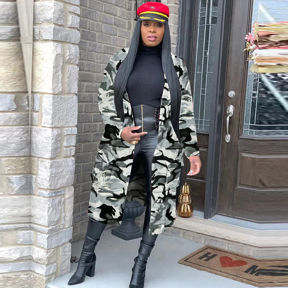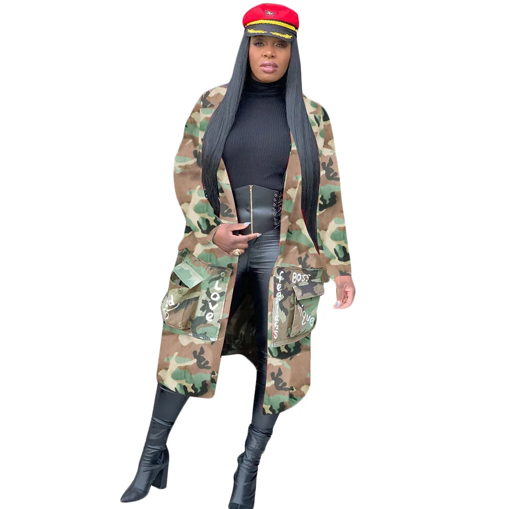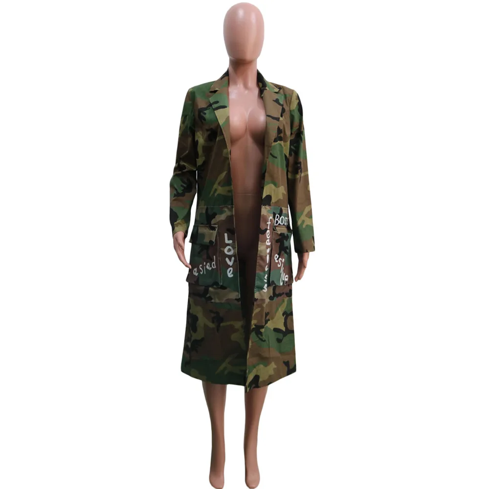 Осенне-зимняя камуфляжная куртка с надписью, женское длинное пальто с отложным воротником, уличная одежда, облегающая куртка с длинными рукавами и карманами