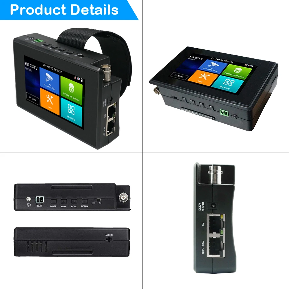 4 дюймовый сенсорный экран H.265/H.264 IP + аналоговый + 8MP AHD + 8MP CVI + 8MP TVI + POE Выход + DC12/3A Выход;Дополнительная функция тестирования сетевой линии (дополнительный сетевой порт) + Тестовая коробка сетевого кабеля