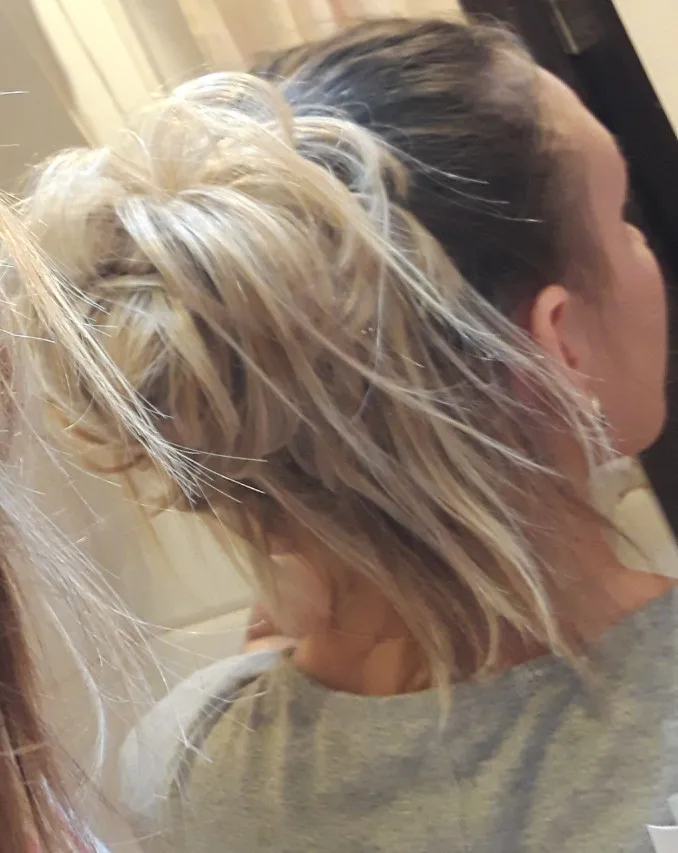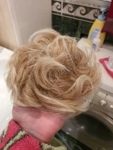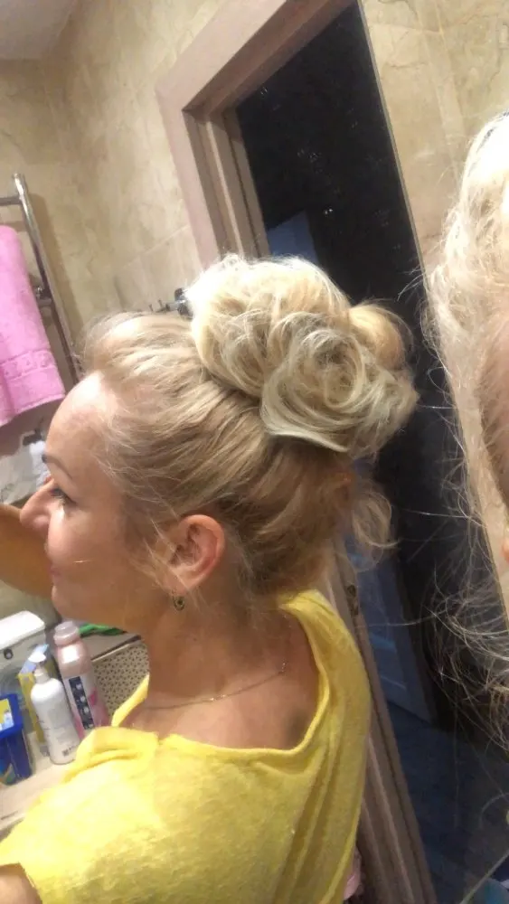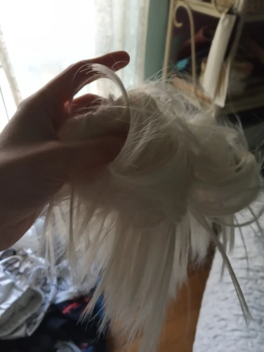 Шиньон похож на натуральный, пышный, хотя волосы на нем короткие, оттенок желтоватый.