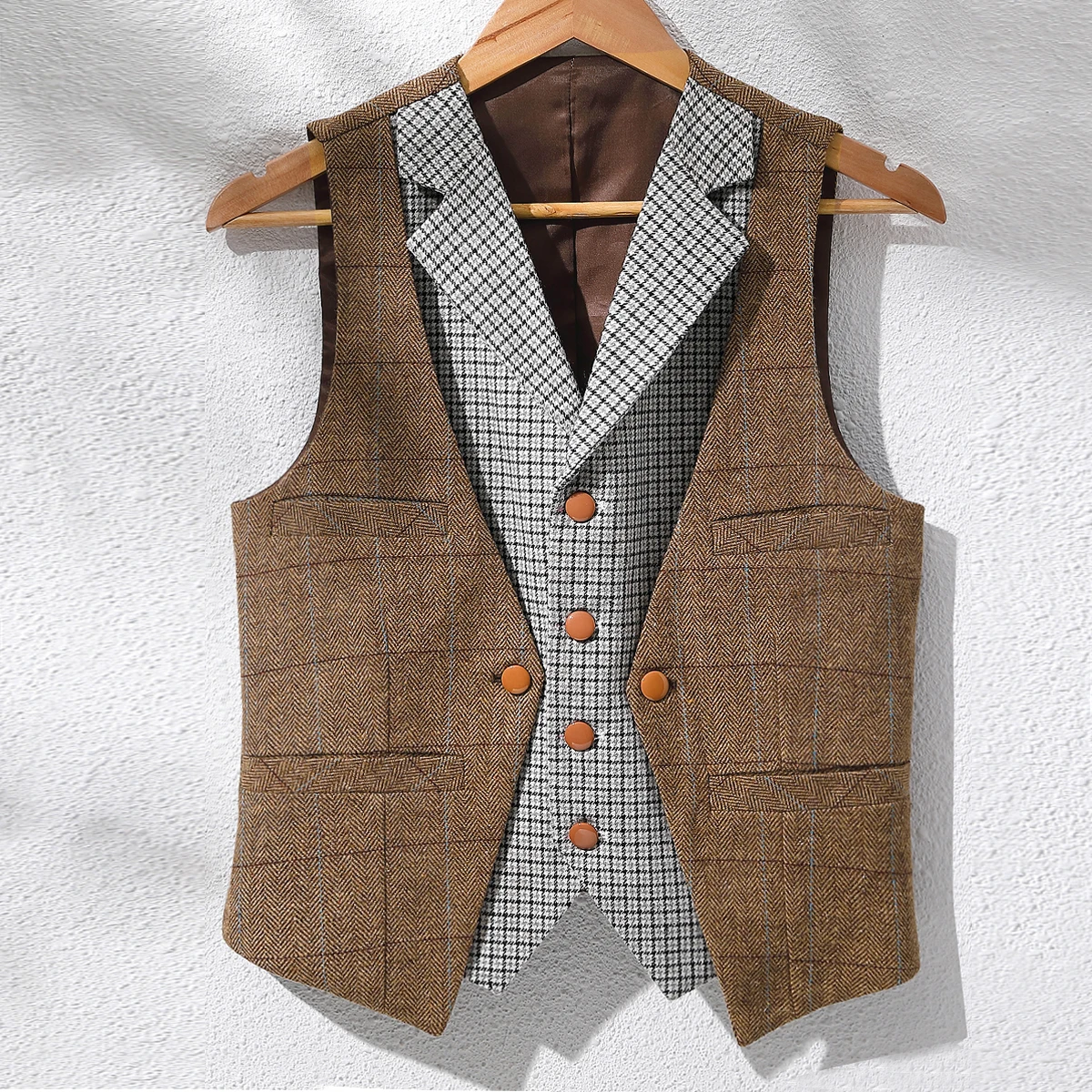 Коричневый мужской клетчатый шерстяной жилет, многослойный твидовый...