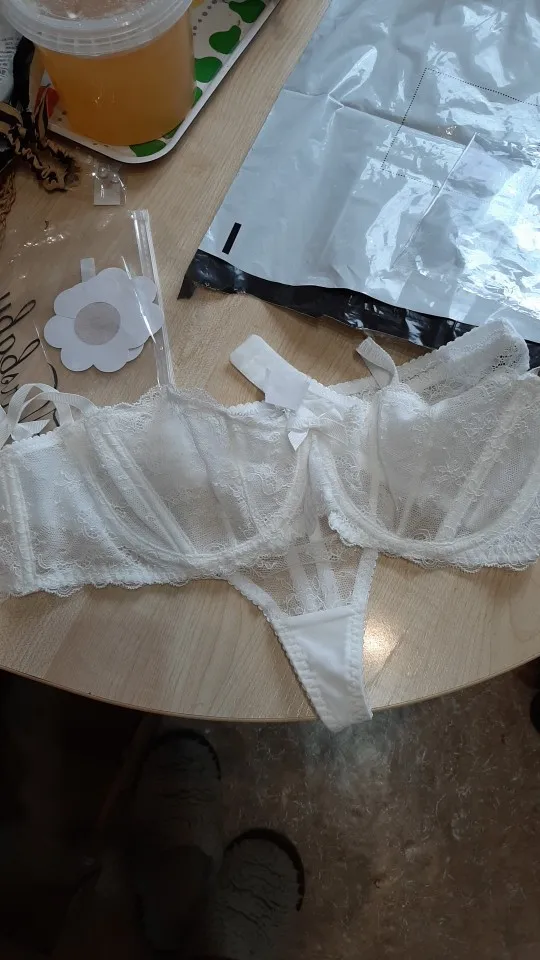 Красивый комплект, на третий размер(75С) сперва заказала С, потом заказала D. Трусы кстати в прошлый раз тоже подкачали с размером(там в комлекте было даже 2 пары, но они были М), на объем 100 см нужно XL(если что при заказе в сообщении можно написать нужный вам размер трусиков). Очень советую сразу всем комплектом брать, с поясом и чулками, офигенно выглядит. Особенность лифа в том что соски прямо норовят выглянуть, это очень сексуально смотрится. Теперь хочу такой чёрный)