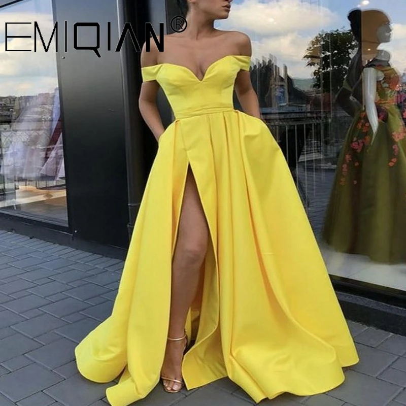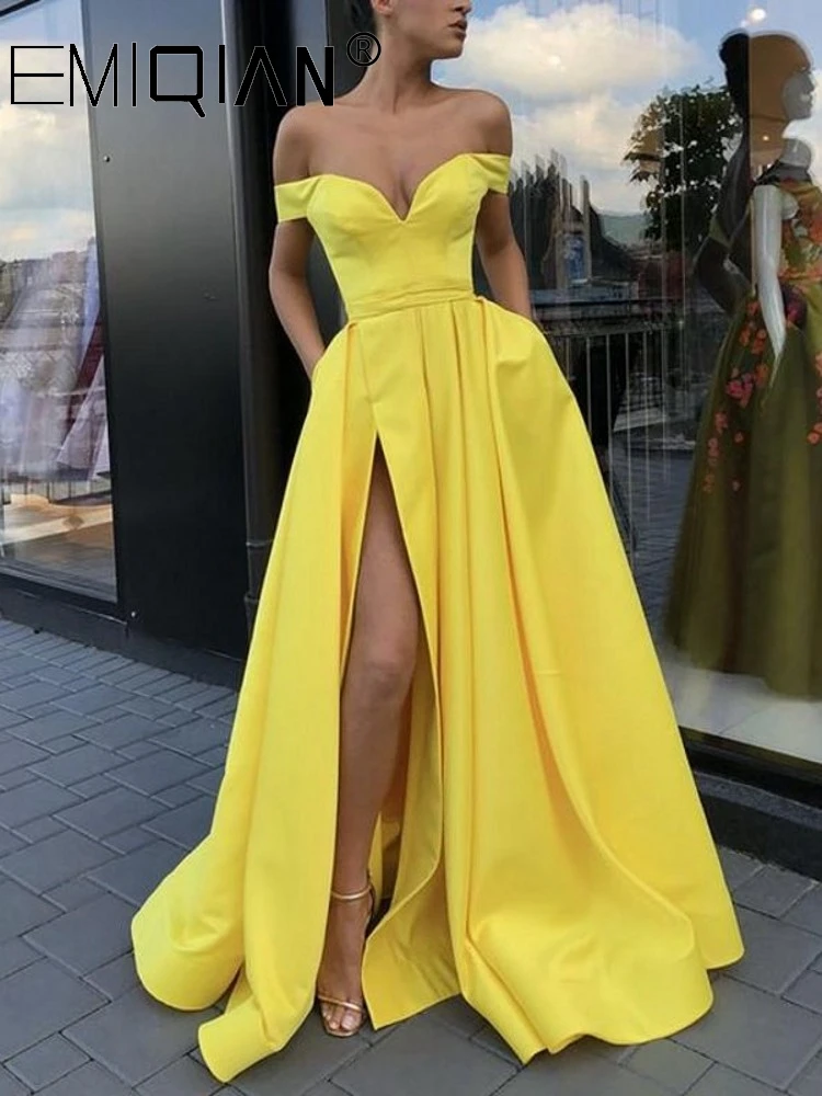 Желтое вечернее платье с карманами, ТРАПЕЦИЕВИДНОЕ ПЛАТЬЕ с открытыми плечами и высоким разрезом, длинное платье для выпускного вечера