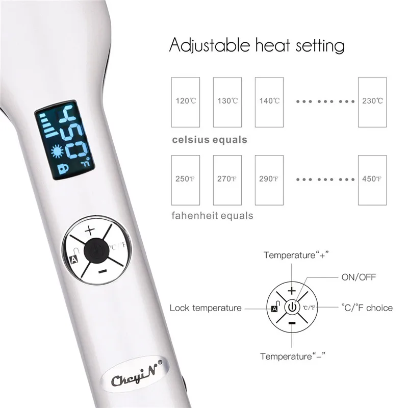 12 передач Регулируемая температура от 120 ℃ до 230 ℃(250 ℉ до 450 ℉) предназначена для удовлетворения ваших потребностей и подгонки для различных типов волос.