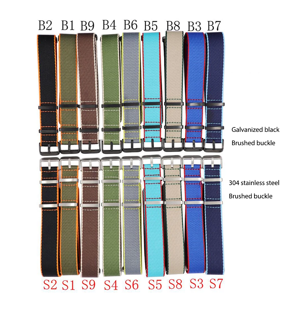[Ширина]: 20 мм 22 мм [Длина]: длинный ремень около 270-275 мм [Толщина]: 1,5 мм один ремешок [Цвет]: 9 цветов цвет s [Пряжка]: пряжка из нержавеющей стали 304L, толщина пряжки 2,0 мм [Материал]: нейлоновая парусина