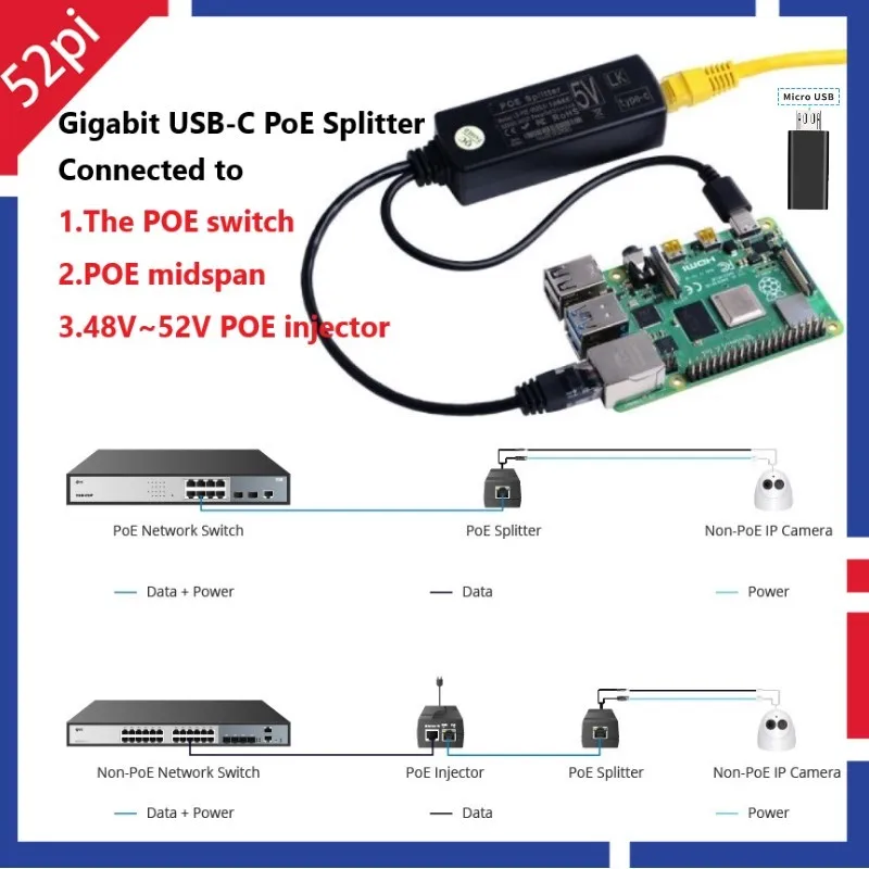 52Pi Gigabit Raspberry Pi PoE разветвитель Gigabit USB Type C Power Over Ethernet IEEE 802.3af PoE Switch Extension