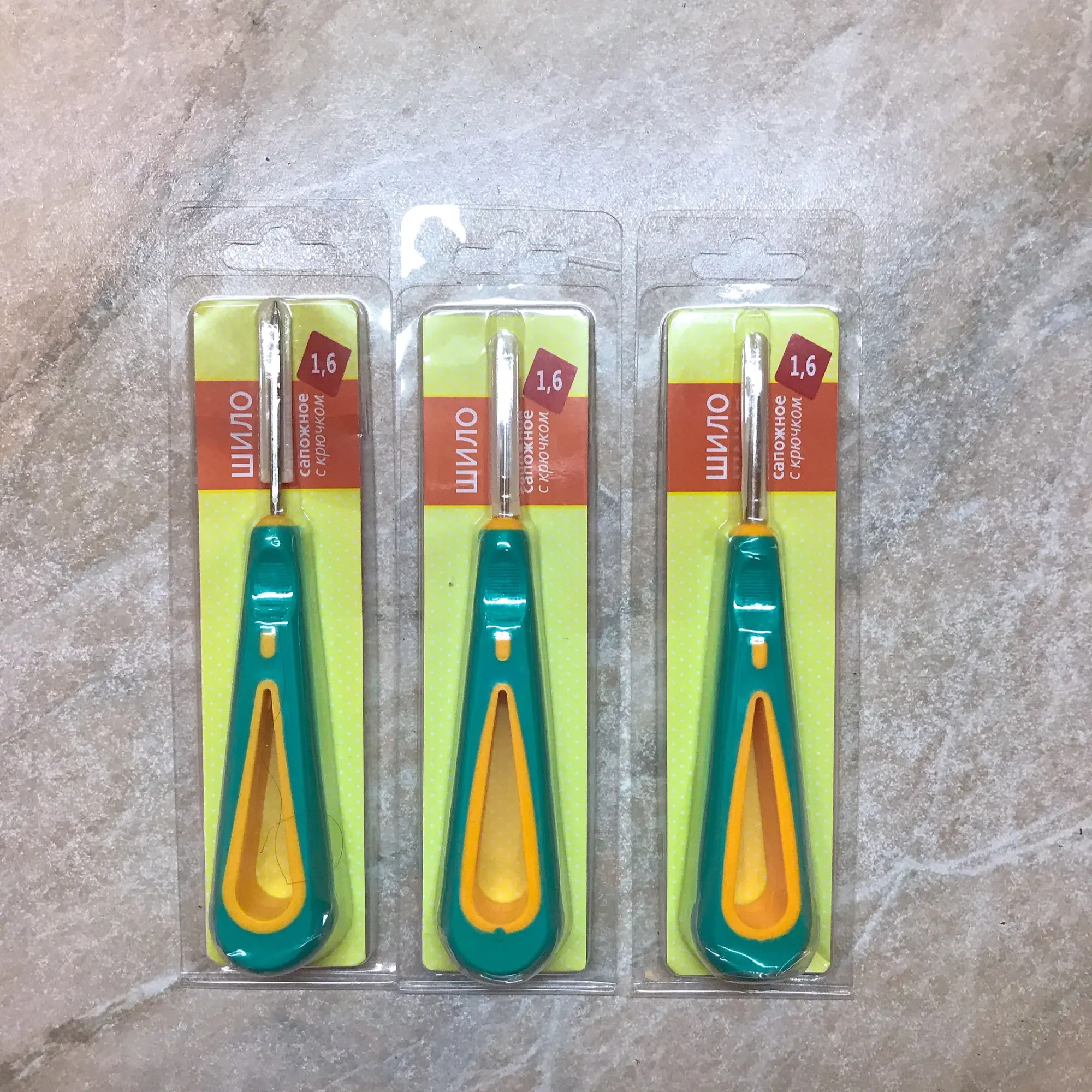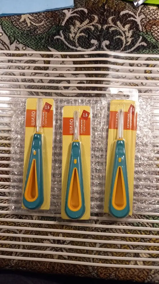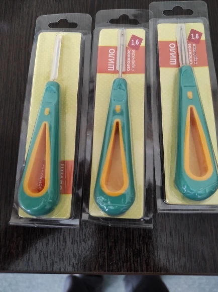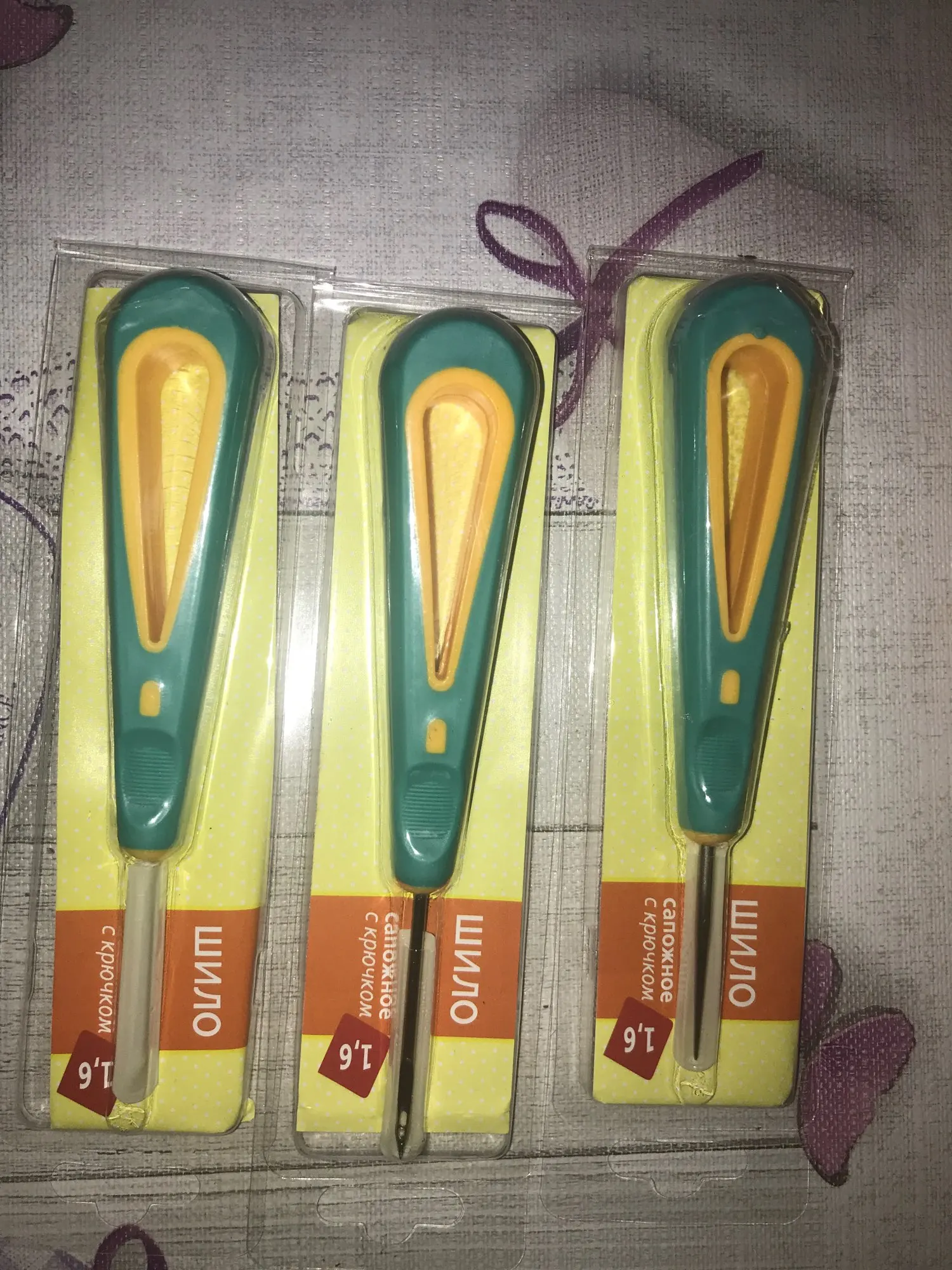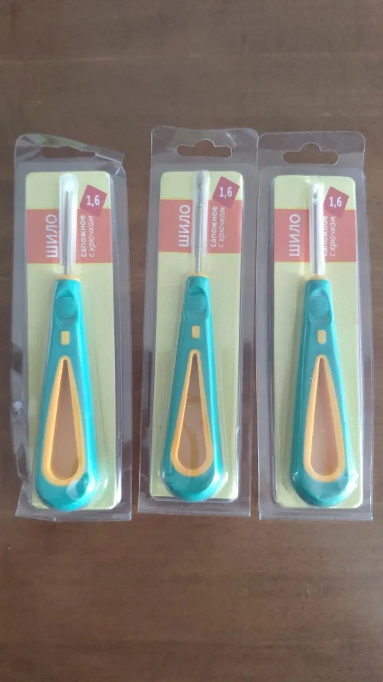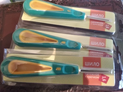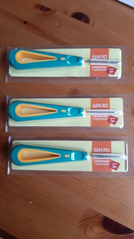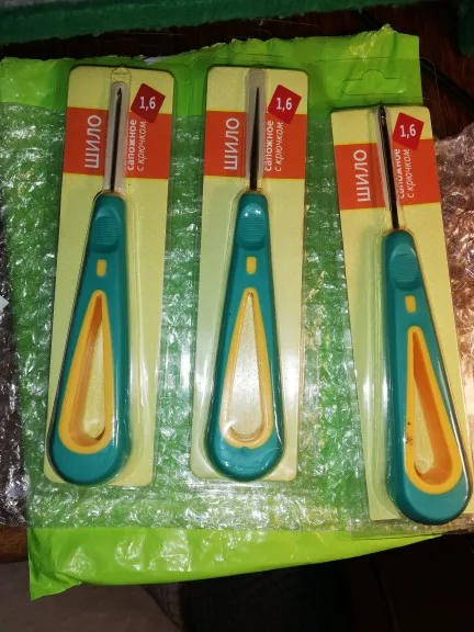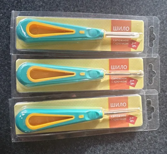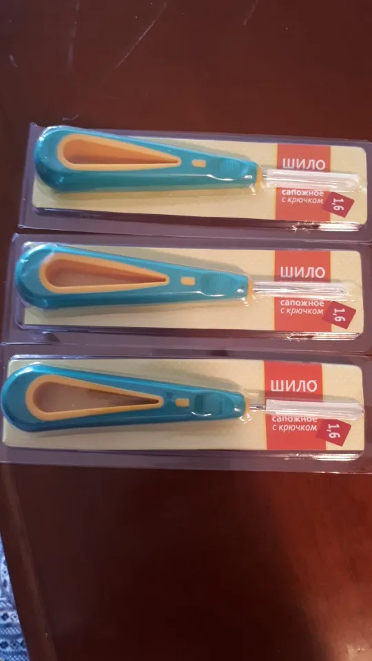 Выглядят толстовато для подшивки обуви, но 1,6 мм. Ручка хорошая очень удобная, надо пробовать в деле. Три вида- прямая, крючок и ушко, но на каждой написано что это шило с крючком)). Качество хорошее. Рекомендую