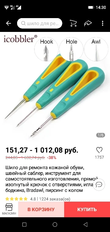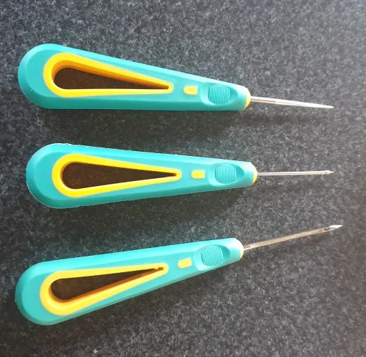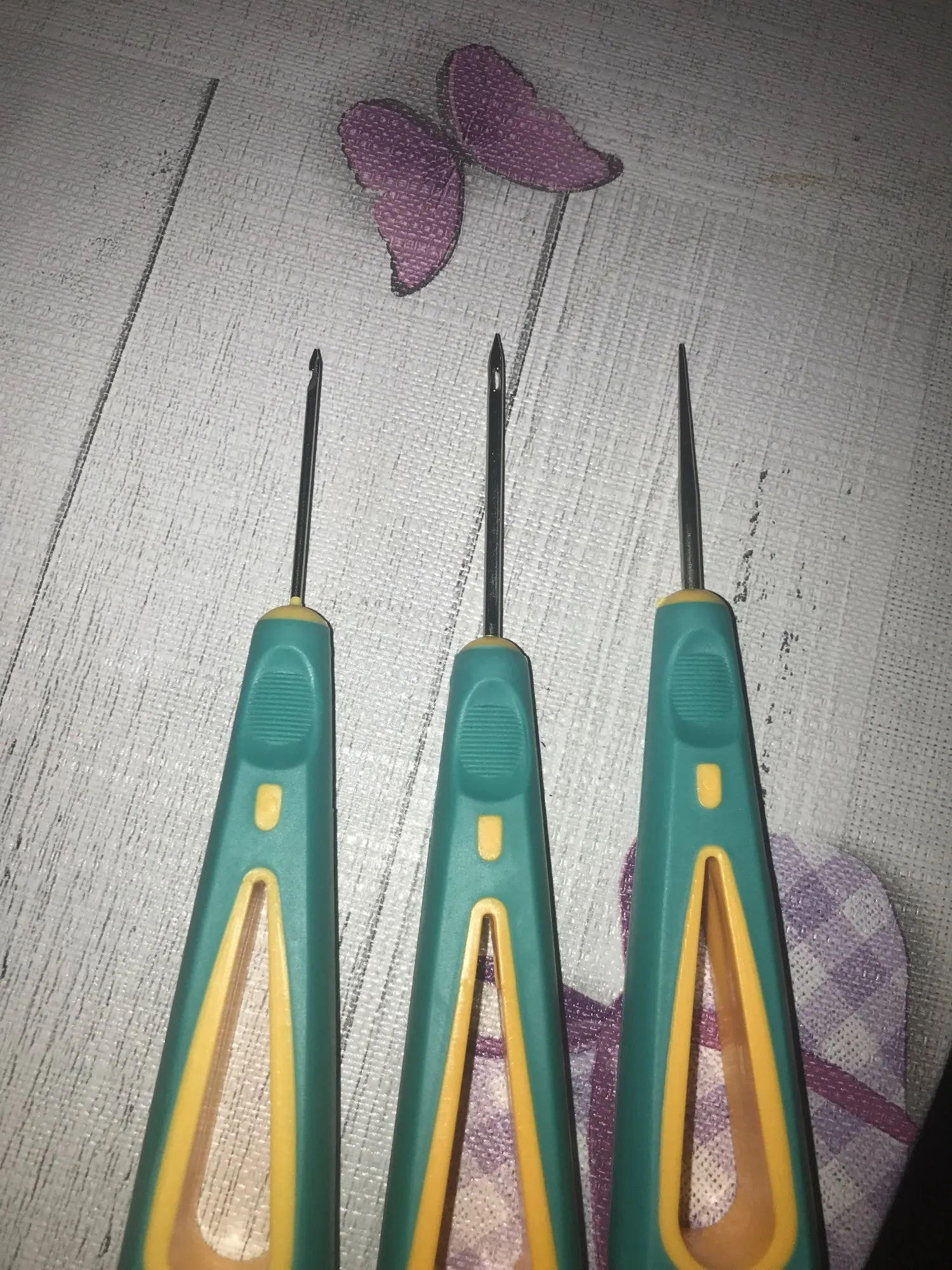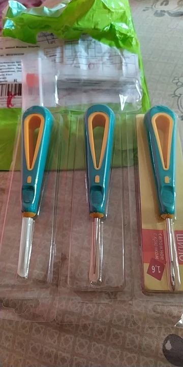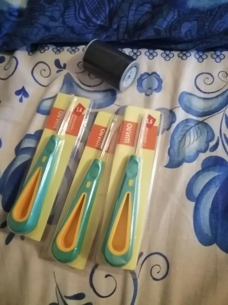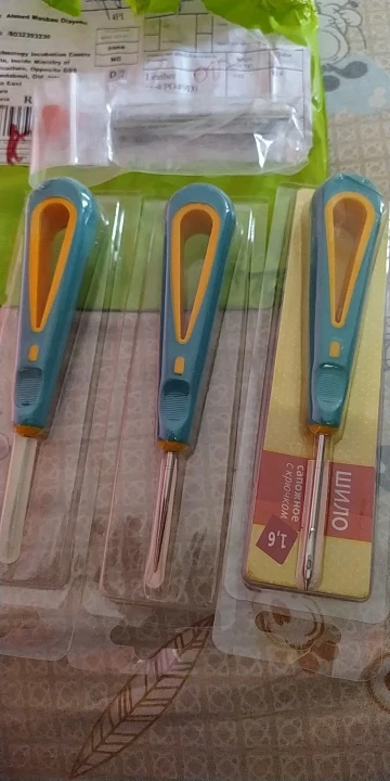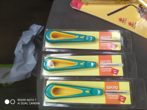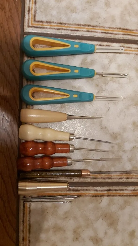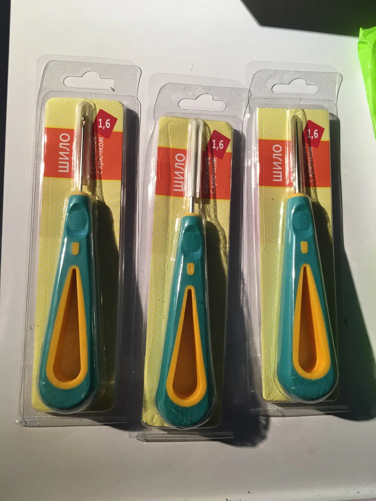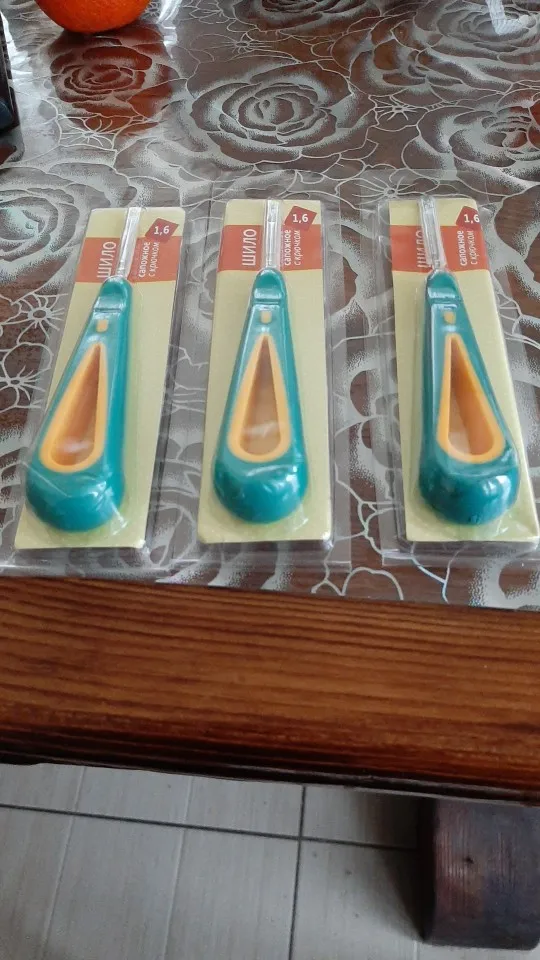 Выглядят толстовато для подшивки обуви, но 1,6 мм. Ручка хорошая очень удобная, надо пробовать в деле. Три вида- прямая, крючок и ушко, но на каждой написано что это шило с крючком)). Качество хорошее. Рекомендую