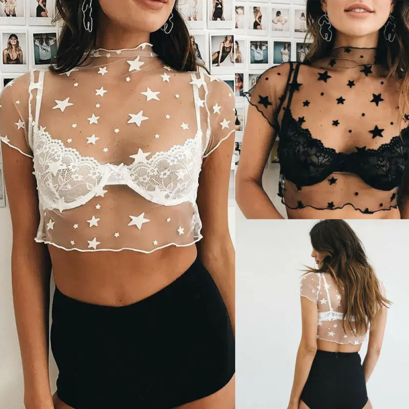 Женский прозрачный сетчатый укороченный топ со звездами, прозрачные...