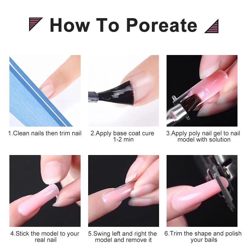 Шаг использования:1. Нанесите Базовое покрытие, выдержите 1-2 минуты2. Нанесите необходимое количество на кончики ногтей полигеля из резины.3. Используйте кисть для наклеивания раствора для скольжения4. Нанесите полигель для ногтей на Кончики ногтей раствором5. Прикрепите накладной ноготь к ногтю и убедитесь, что он полностью залезет, выдержите 2 минуты6. Снимите наконечник false nai7. Обрежьте ноготь до подходящей длины8. Обрежьте shaoe и отполируйте ногти9. Нанесите верхний слой, выдержите 1-2 минуты