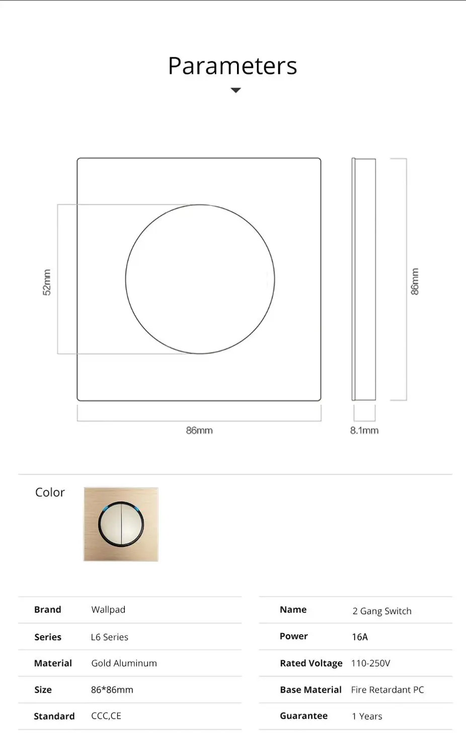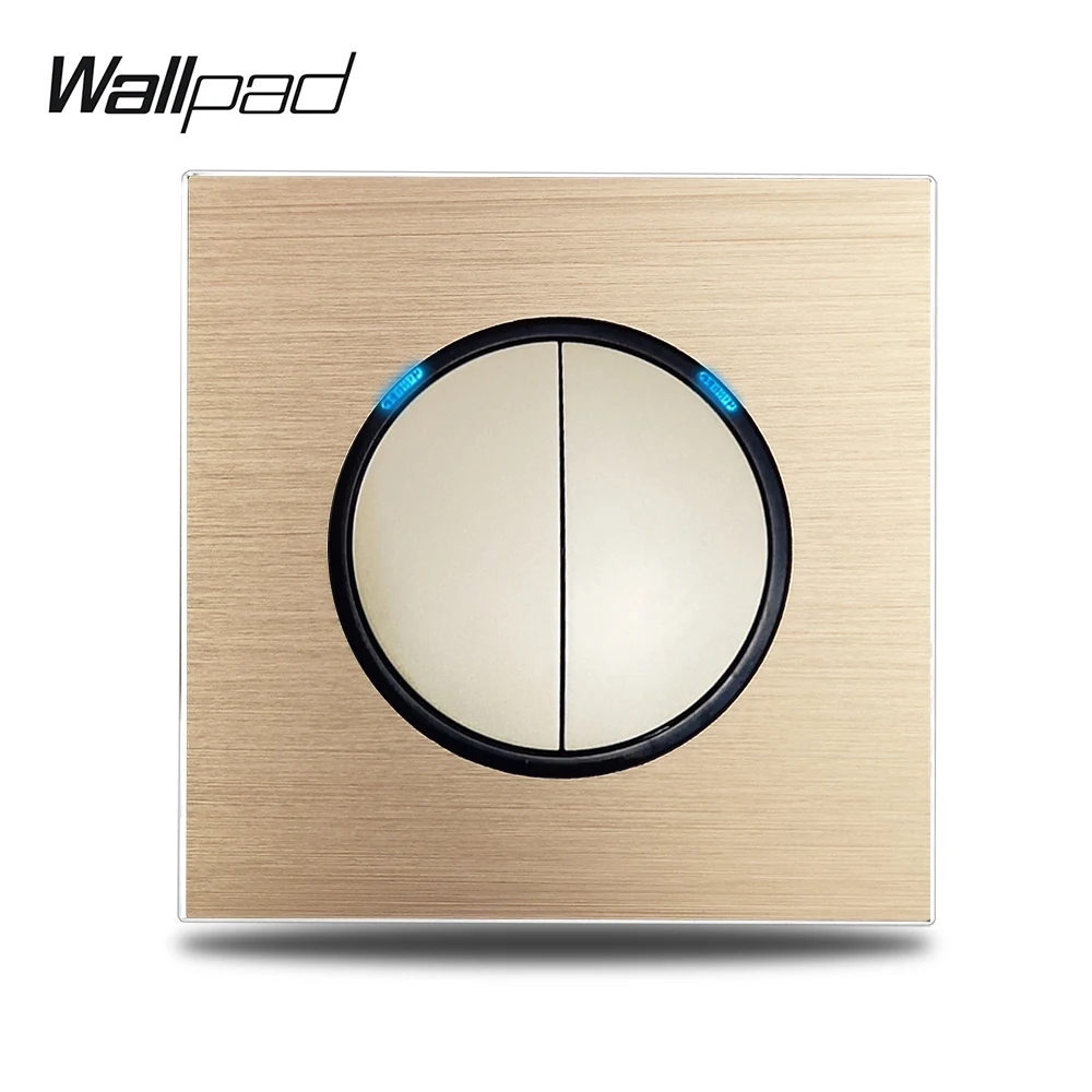 Wallpad Gold L6 2-клавишный светильник ключатель света 1-сторонний 2-сторонний щеткой Золотая алюминиевая пластина Кнопка возврата с синим светодиодным индикатором, подходит для Люминесцентная лампа, галогенная лампа, энергосберегающая лампа светодиодный ная лампа. Мягкий синий светодиодный индикатор будет гореть, когда светильник выключен, и будет выключен, когда светильник включен. Так что вы можете легко найти выключатель в темноте.