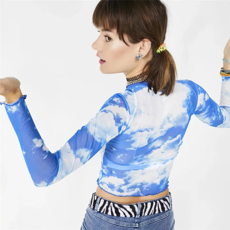 Женская Повседневная приталенная накидка для бикини, с длинным рукавом и круглым вырезом, прозрачная, с принтом голубого неба