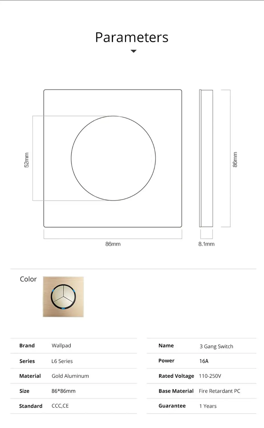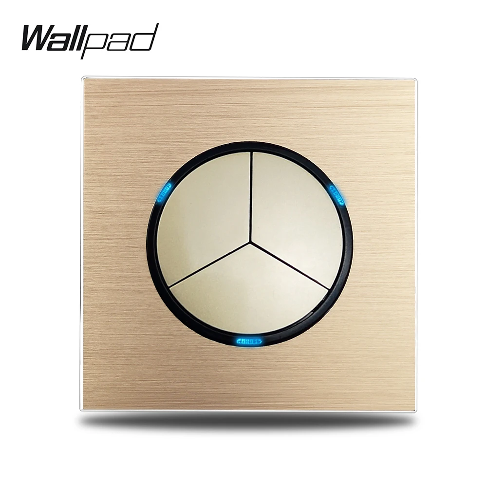 Тройной светильник ключатель Wallpad Gold L6 3 Gang, односторонний, двухсторонний, матовая Золотая алюминиевая пластина, Кнопка возврата с синим светодиодный ным индикатором, подходит для Люминесцентная лампа, галогенная лампа, энергосберегающая лампа светодиодный Светодиодная лампа. Мягкий синий светодиодный индикатор будет гореть, когда светильник выключен, и будет выключен, когда светильник включен. Таким образом, вы можете легко найти переключатель в темноте.