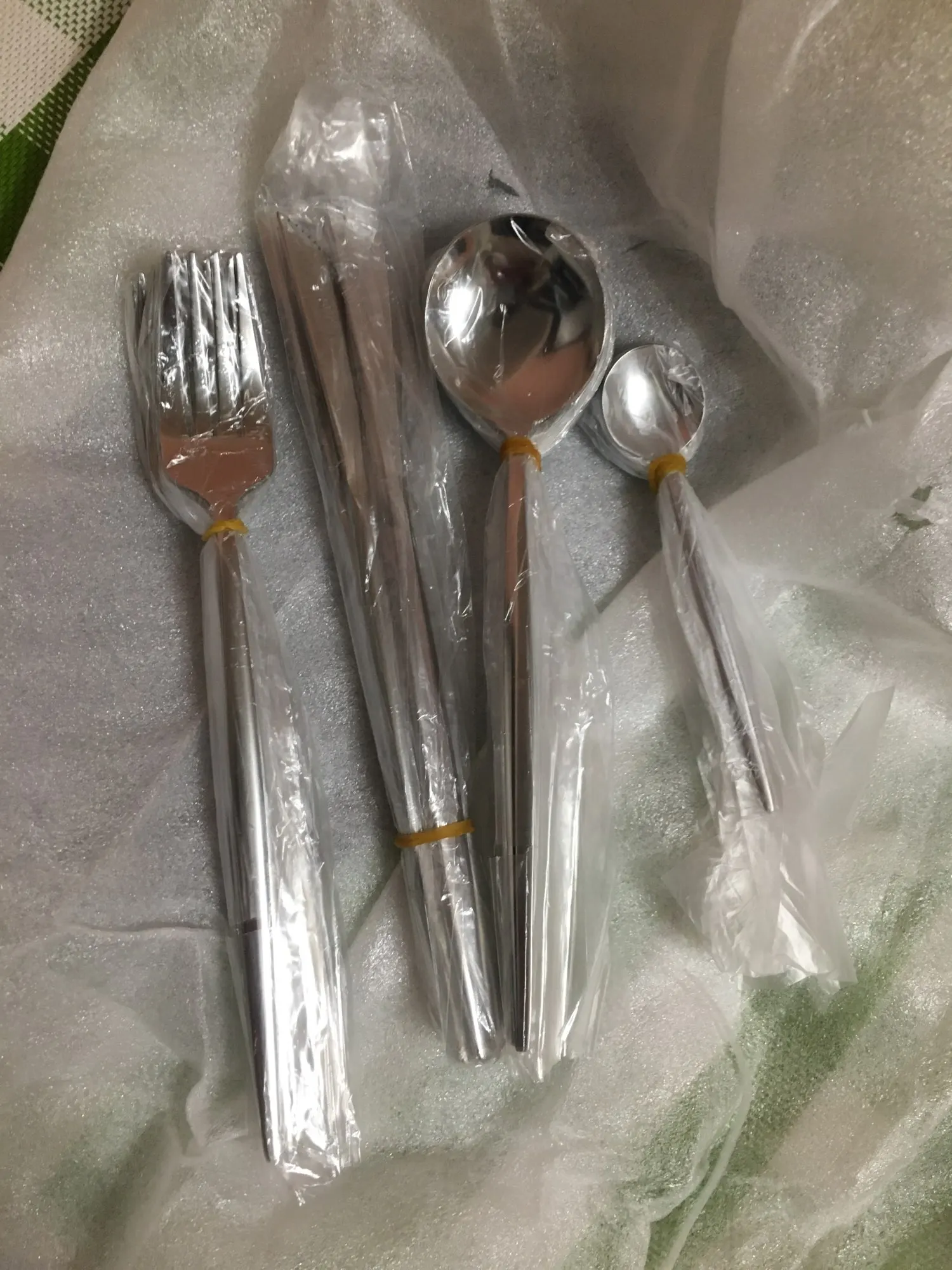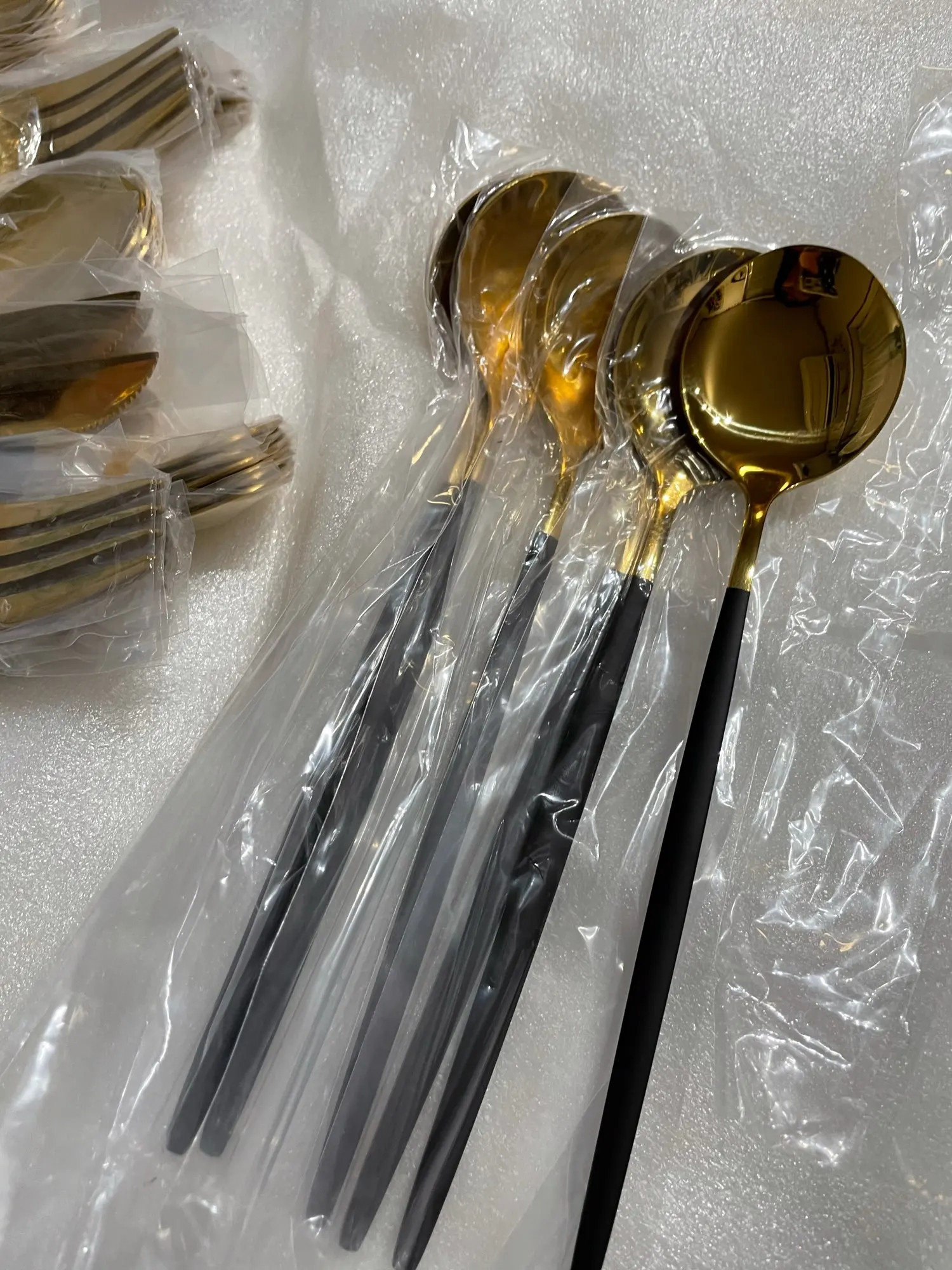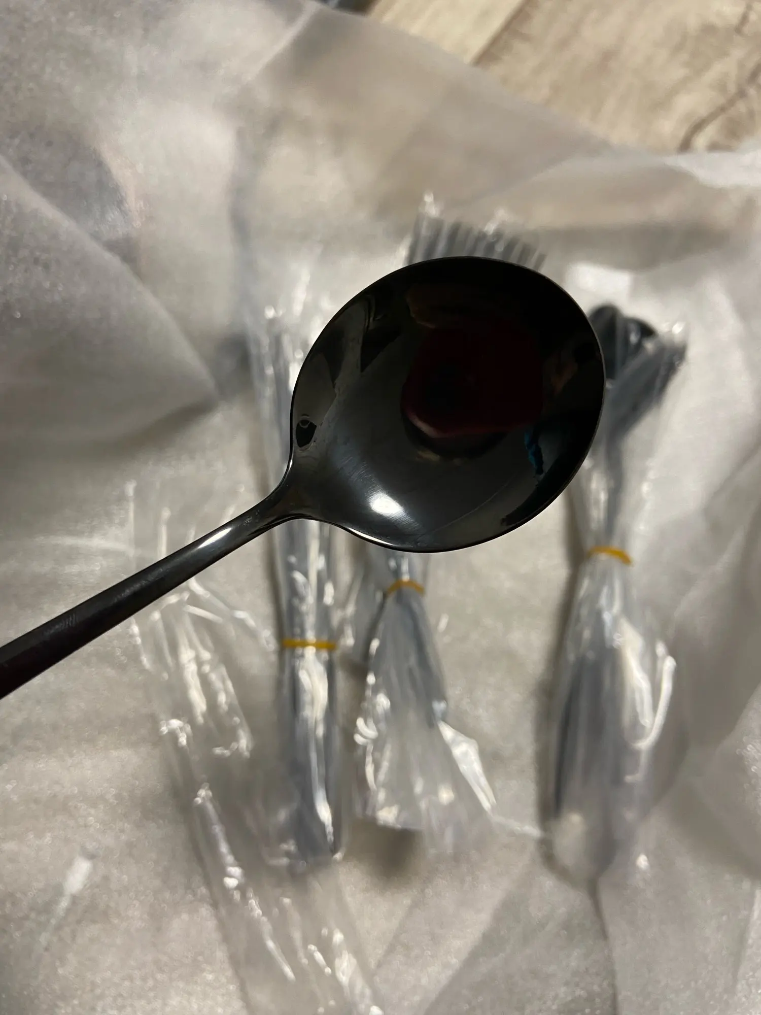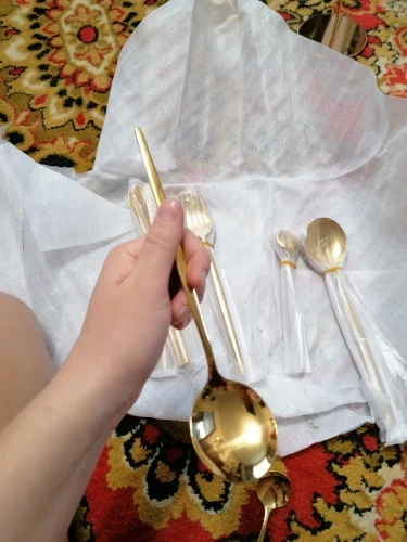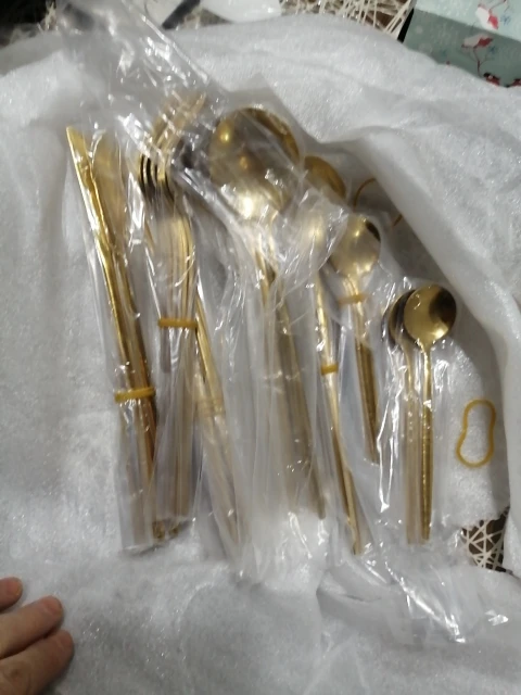 Посылка пришла за 2 недели! Упаковано на совесть! Еле размотала эти сто слоев пенки. Сами приборы очень милые и изящные. Без дефектов, покрытие все целое. Ложки для жидких супов не совсем привычные, удобнее ими есть крем - супы и десерты. В целом, покупкой довольна