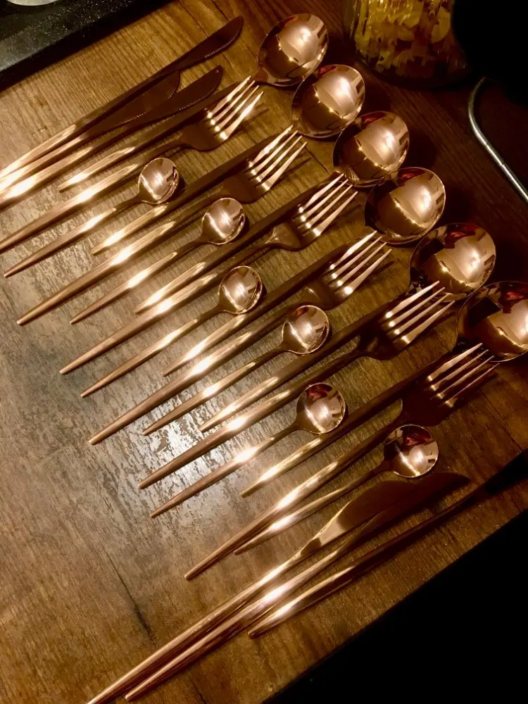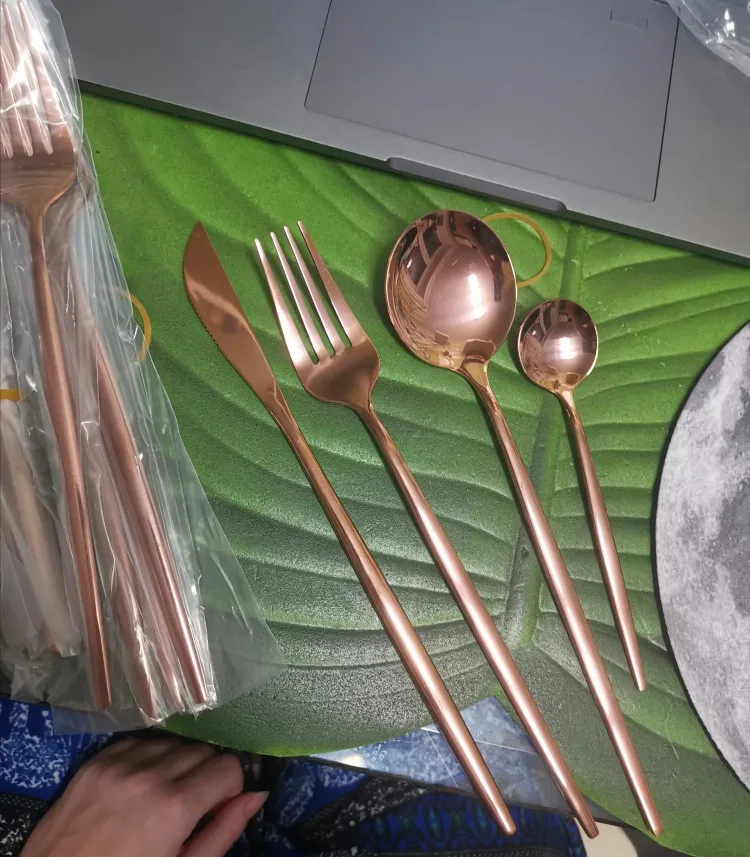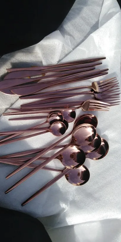 Набор просто шикарный!!! Пришел всего за две недели. Каждый прибор был в пленке и ещё дополнительно продавец бережно завернул набор в мягкую защитную упаковку чтобы не повредился при транспортировке. Приборы в меру тяжёленькие, прокраска идеальная а цвет « розовое золото» смотрится очень круто. Жена довольна! Теперь ужинать вдвойне приятней. Спасибо продавцу! С удовольствием реккомендую данный товар к покупке!