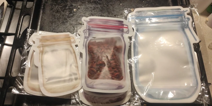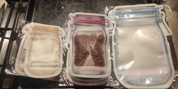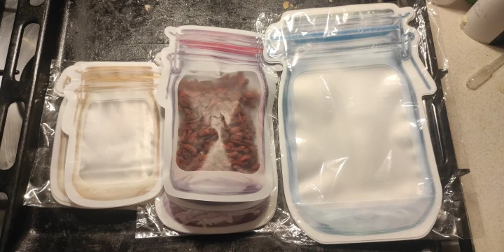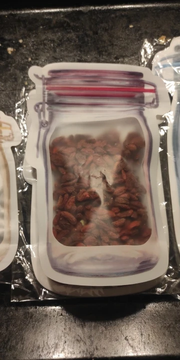 Заказывала ранее размером чуть больше, теперь эти. Закрываются отлично, прочно, сам материал очень плотный. По размеру они больше подходят для орехов, для этого и брала. Заказ доставили где-то за 2-2.5 недели до МО. Рекомендую!