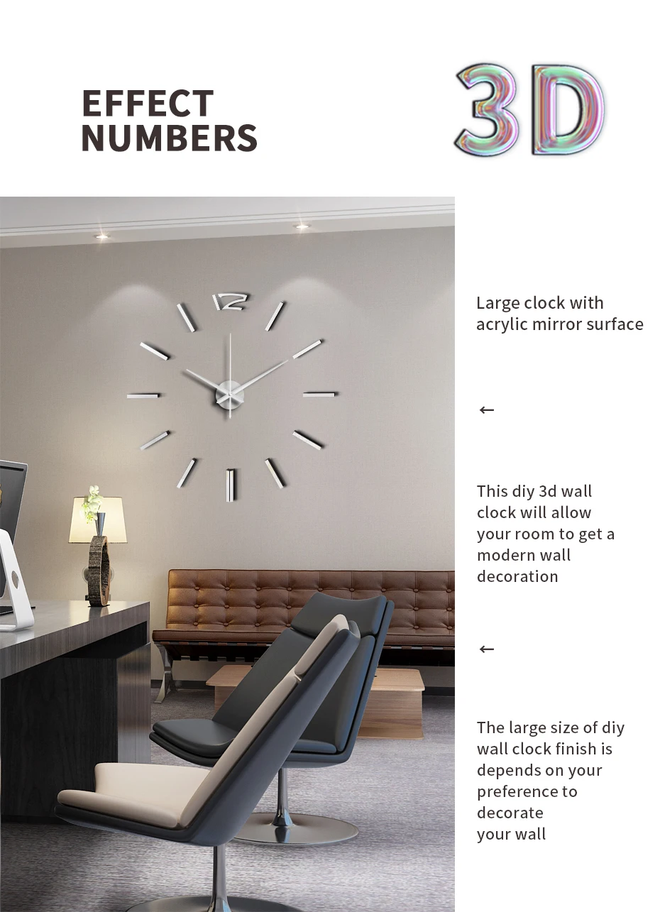 Часы с большим размером и акриловой зеркальной поверхностью, эти 3D настенные часы Сделай Сам позволят вашей комнате стать современным украшением стен. Размер отделки больших настенных часов «сделай сам» зависит от вашего предпочтения украсить стену.