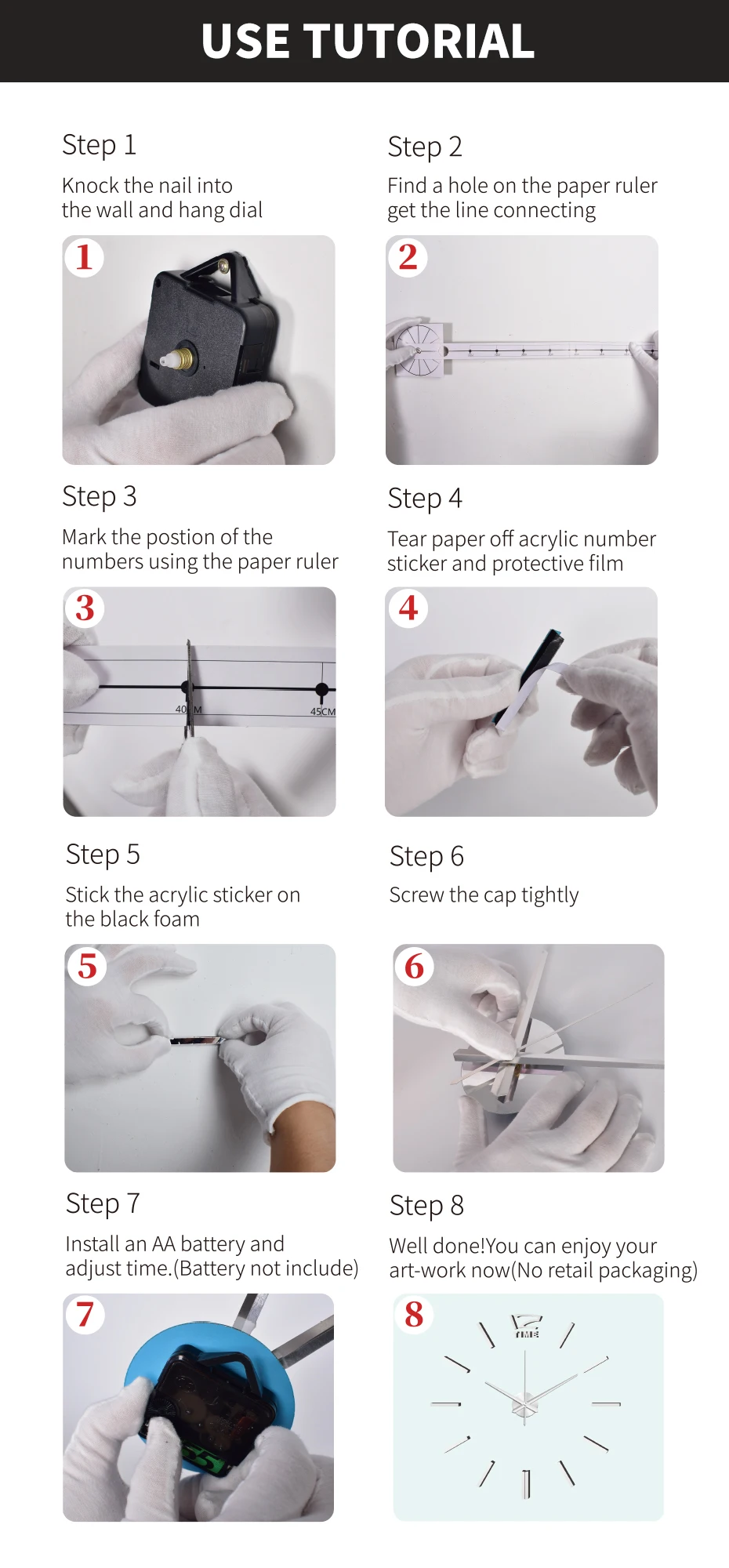 Шаг 1: Закрепите часовой механизм на стене Шаг 2: отклейте защитную пленку от зеркала, наклейте ее на номер EVA. Накройте часовой механизм вспомогательной шкалой, наклейте цифры в нужном месте в соответствии со шкалой. Шаг 3: Снимите часовой механизм, зафиксировав часовую стрелку, затем минутную стрелку. Советы: прижмите стрелки часов в ось часов и точку на 12 часов. Шаг 4: Настройте время кнопкой на часовом механизме и Установите батарею. Шаг 5: Повесьте часовой механизм на стену. Шаг 6: молодец! Вы можете получить удовольствие от творчества прямо сейчас (без розничной упаковки)