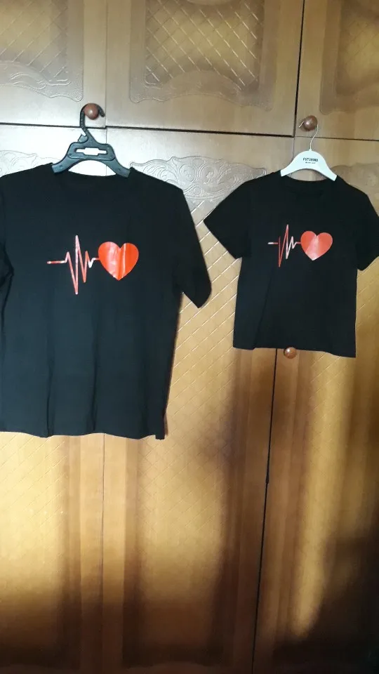 Хорошие футболки, приятные, хлопковые. после стирки рисунок не испортился. Дочке на рост 87 см, вес 13200 размер 90 подошёл отлично. Я ношу 44 размер, выбрала размер М, сидит хорошо.
