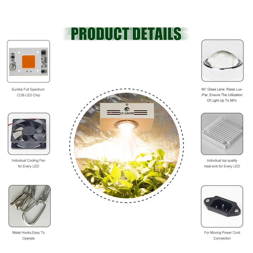 【 90 ° стекло lens】уникальный дизайн оптических линз 90 ° для более высокого эффекта сбора светильник, в то же время, защищает чип COB от пыли и не промокает, сделайте чип более длительным сроком службы. Более высокое номинальное значение и люкс значение, чем обычная Светодиодная лампа для выращивания, уменьшая светильник и снижение номинальной стоимости, Обеспечение использования светильник до 98%. Наш светодиодный светильник может заменить традиционные 150 Вт HPS/MH при потреблении всего 50 Вт.