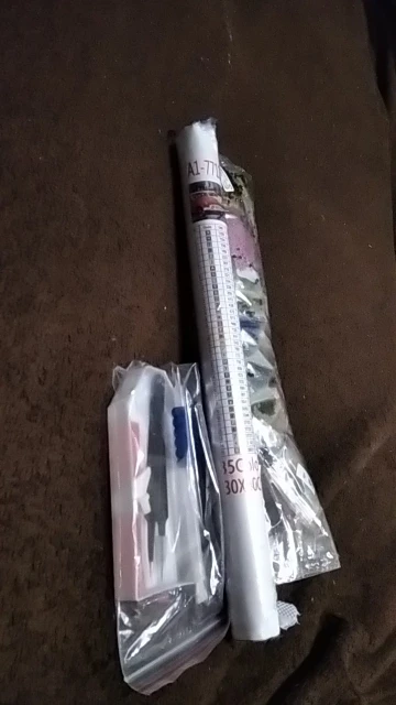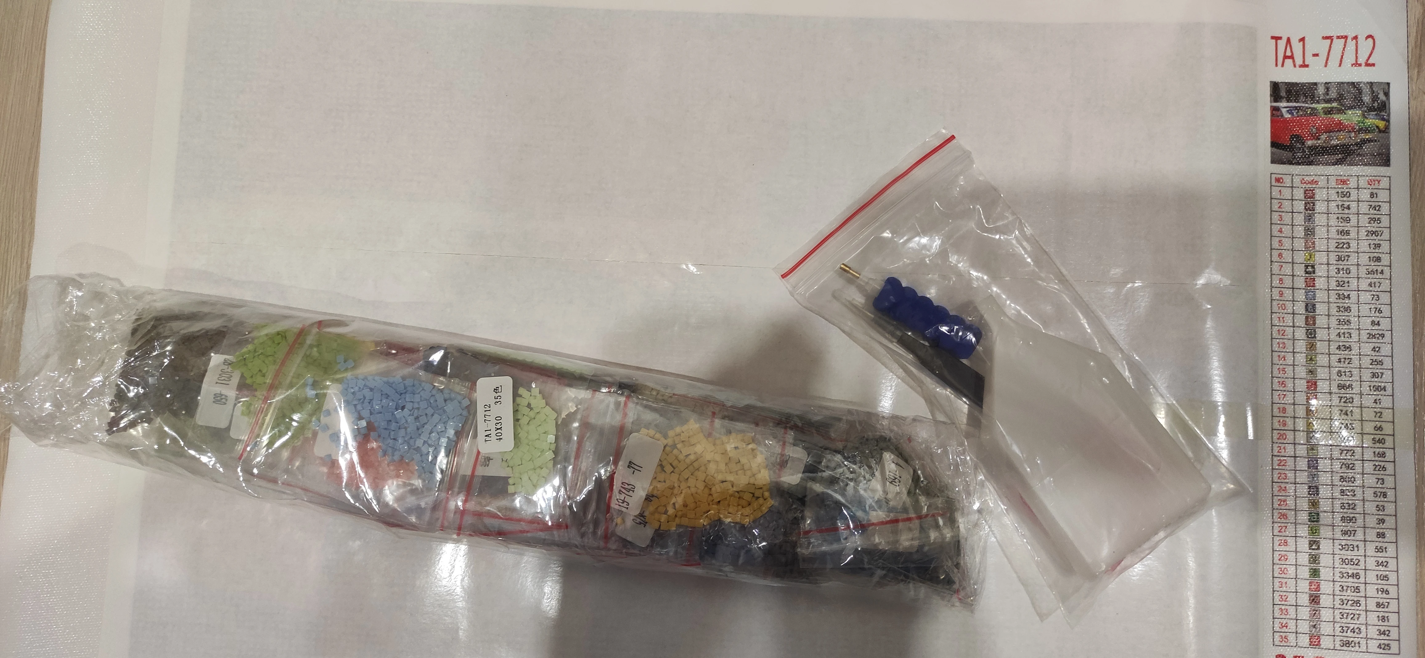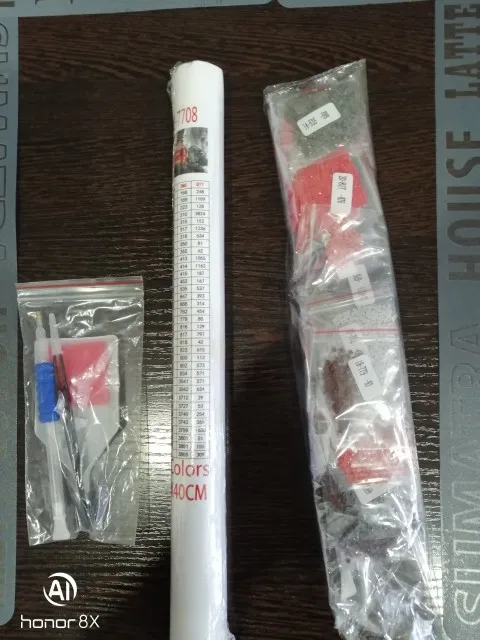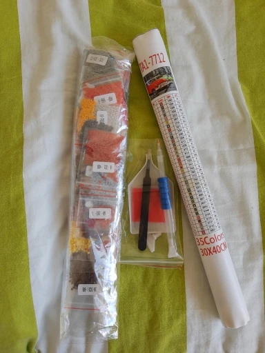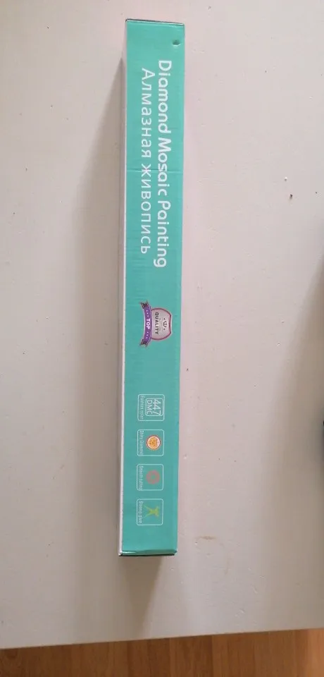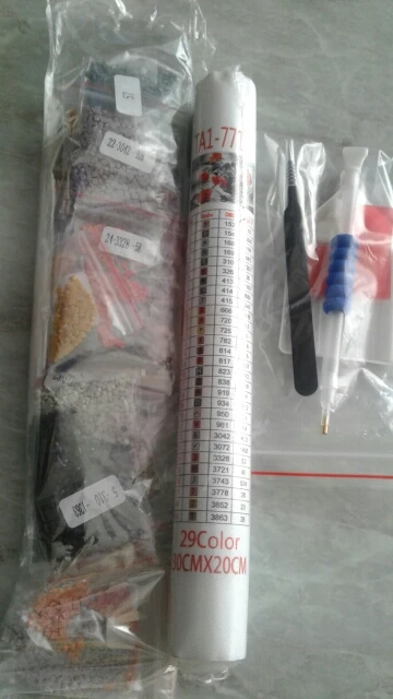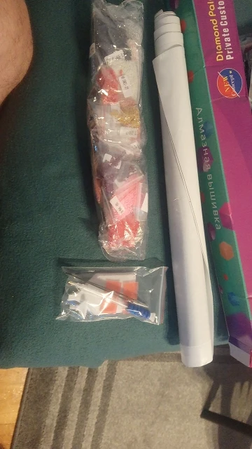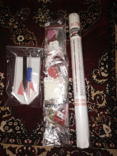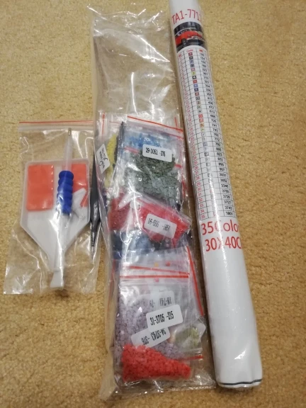 Товар пришел за месяц, упаковка крепкая, картина намотана на валик, не помялось, есть клей, ванночка, пинцет, ручка очень удобная, с насадками, будем рисовать, рекомендую!
