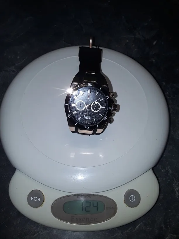 Большие часы, 122 гр веса. Это очень красиво и его внешний вид роскошные часы. Он отлично выполняет свои функции. Это не водонепроницаемый, просто водонепроницаемый. Правильное соотношение цены и качества. Внимание продавца было хорошим и быстрым, эффективно решая очевидные проблемы. Очень доволен этой покупкой.