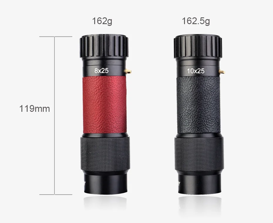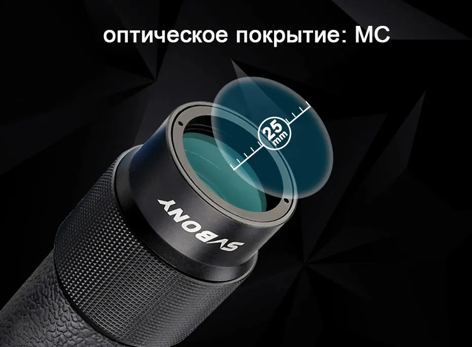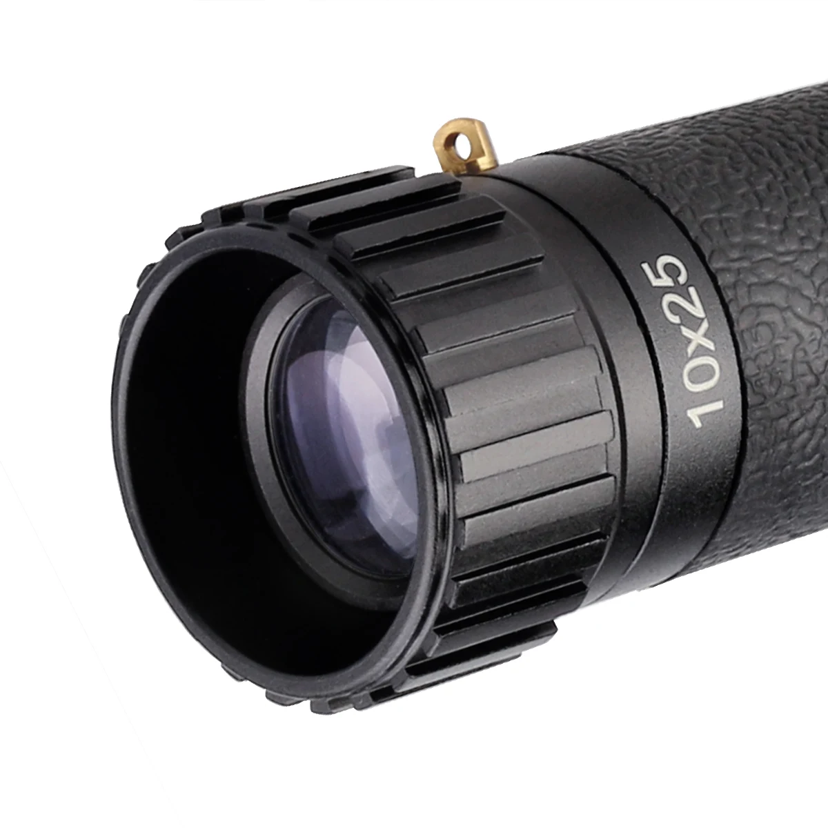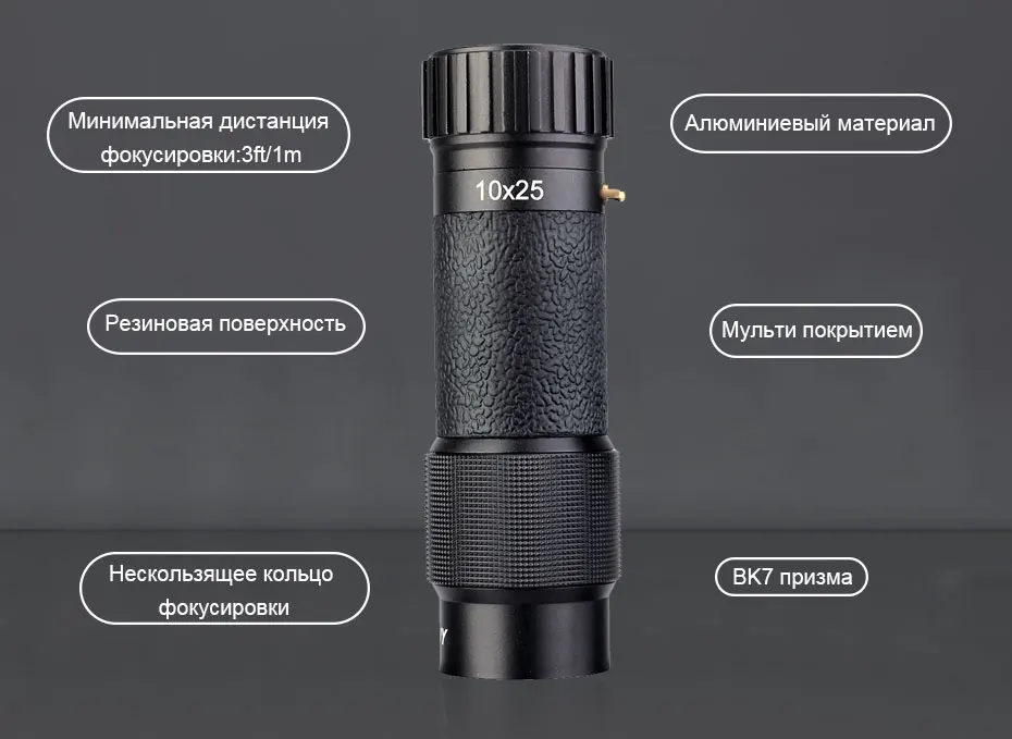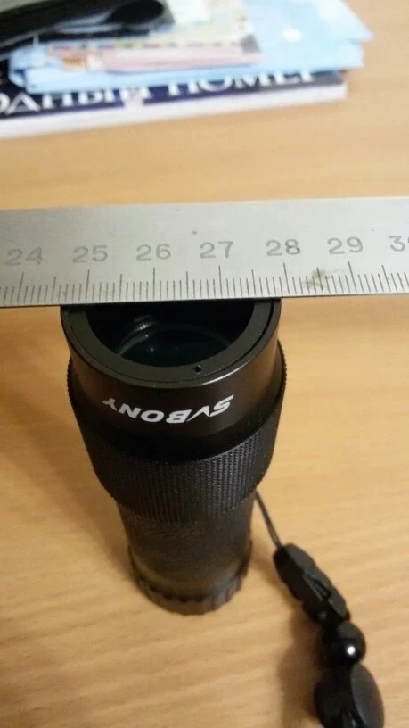 Диаметр объектива - 25 мм, а диаметр выходного зрачка - 4 мм. Получается что реальное увеличение 25/4=6.25, а не 10, как заявлено продавцом. Собственно взяв советский бинокль с увеличениеи 8х убедился что он приближает сильнее чем монокуляр.