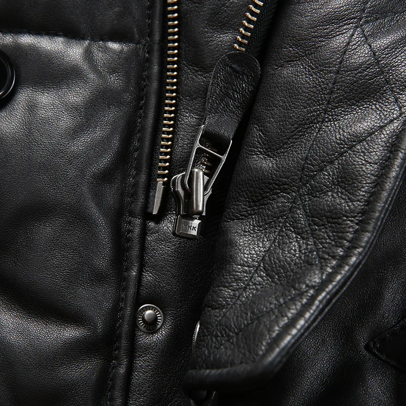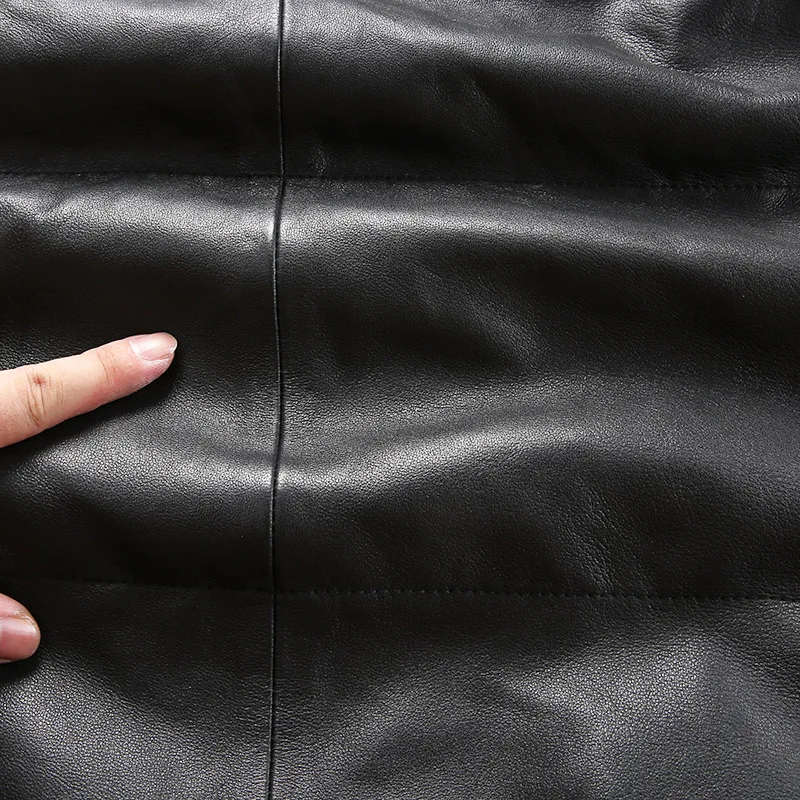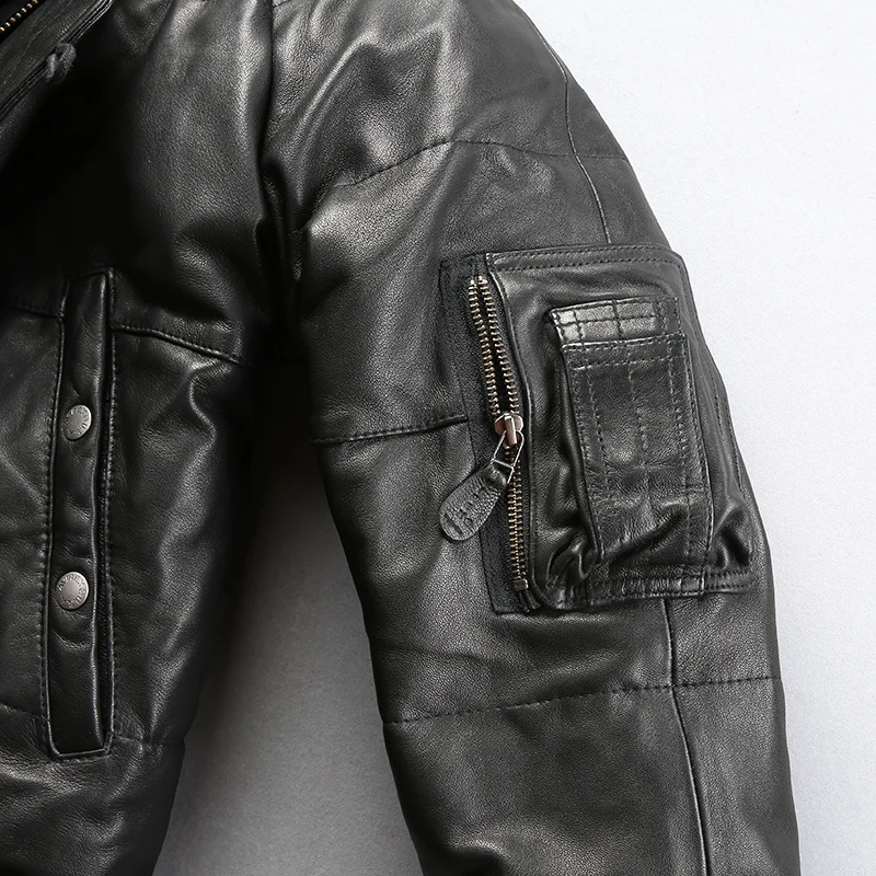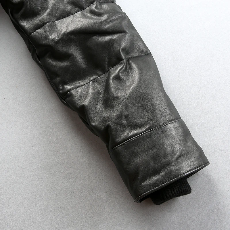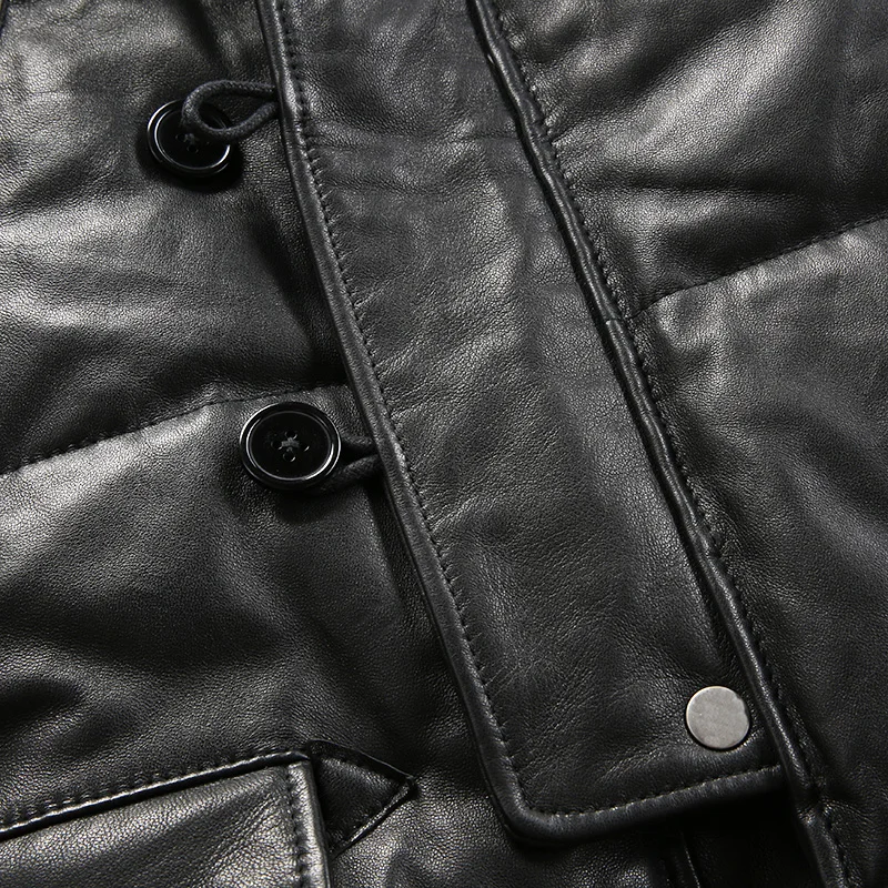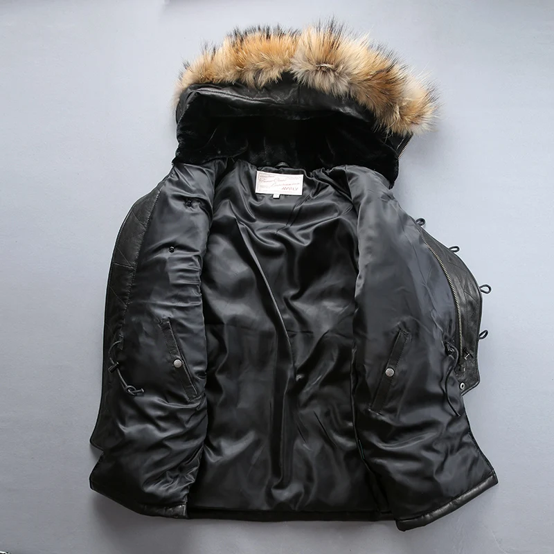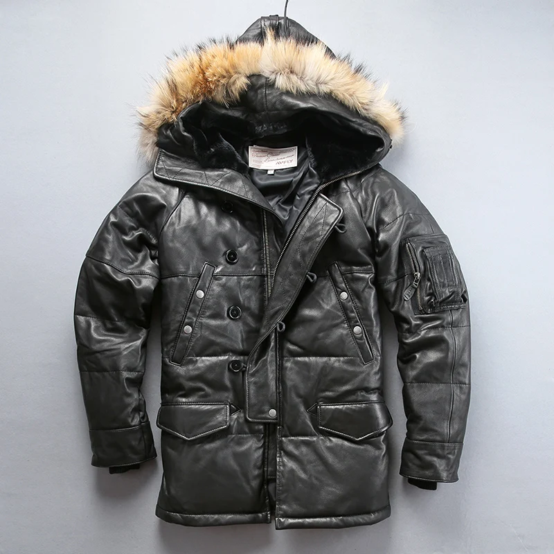 Мужской пуховик из натуральной кожи, с меховым капюшоном, средней длины