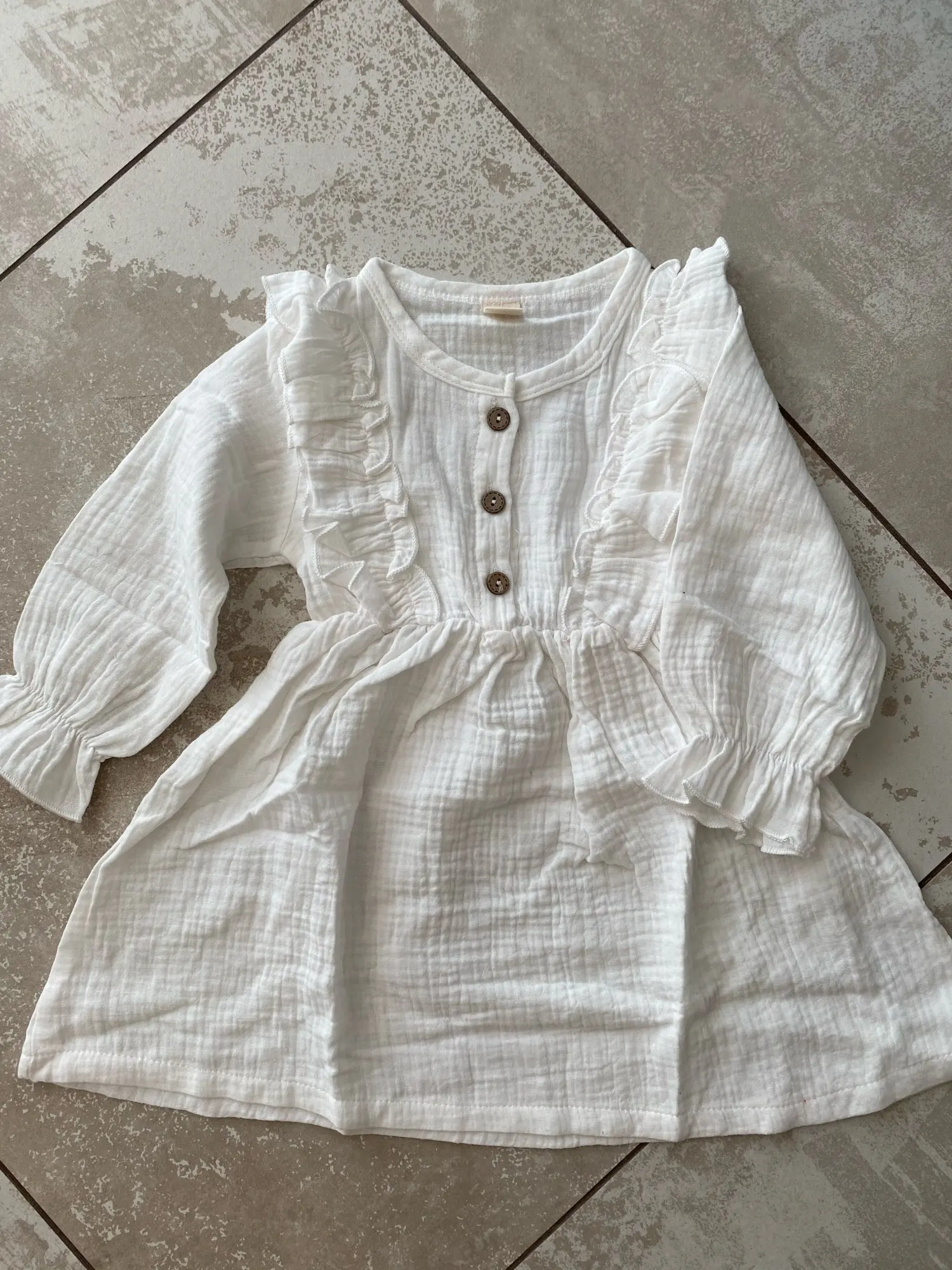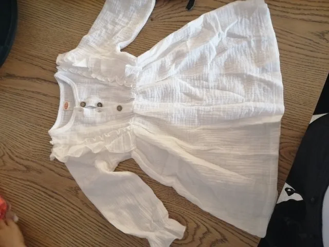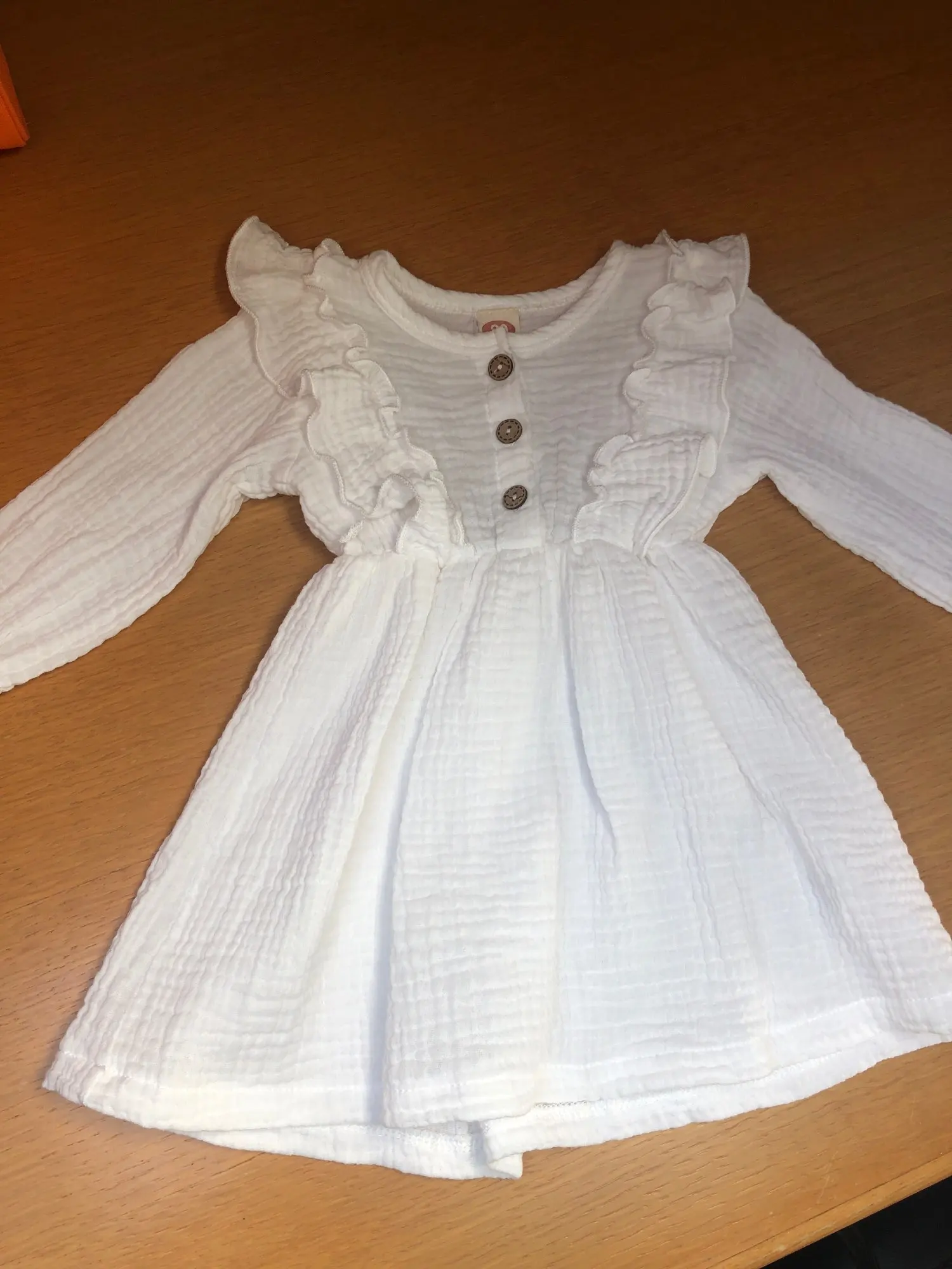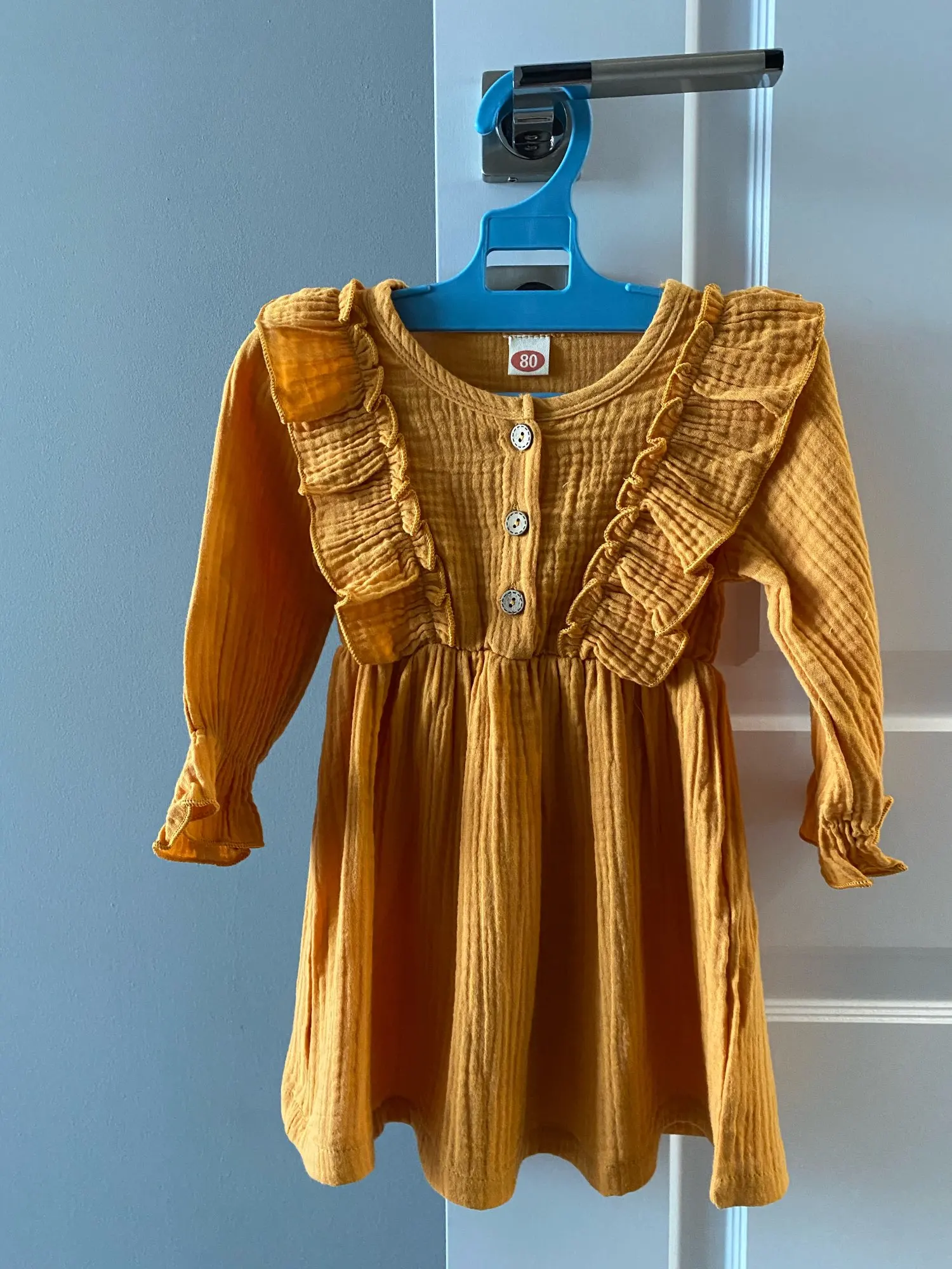 Śliczna sukienka. Miły materiał, drewniane guziczki. Rozmiar 1-2y ma nadruk 80. Na moje dziecko noszące rozmiar 80-86 jest idealna.