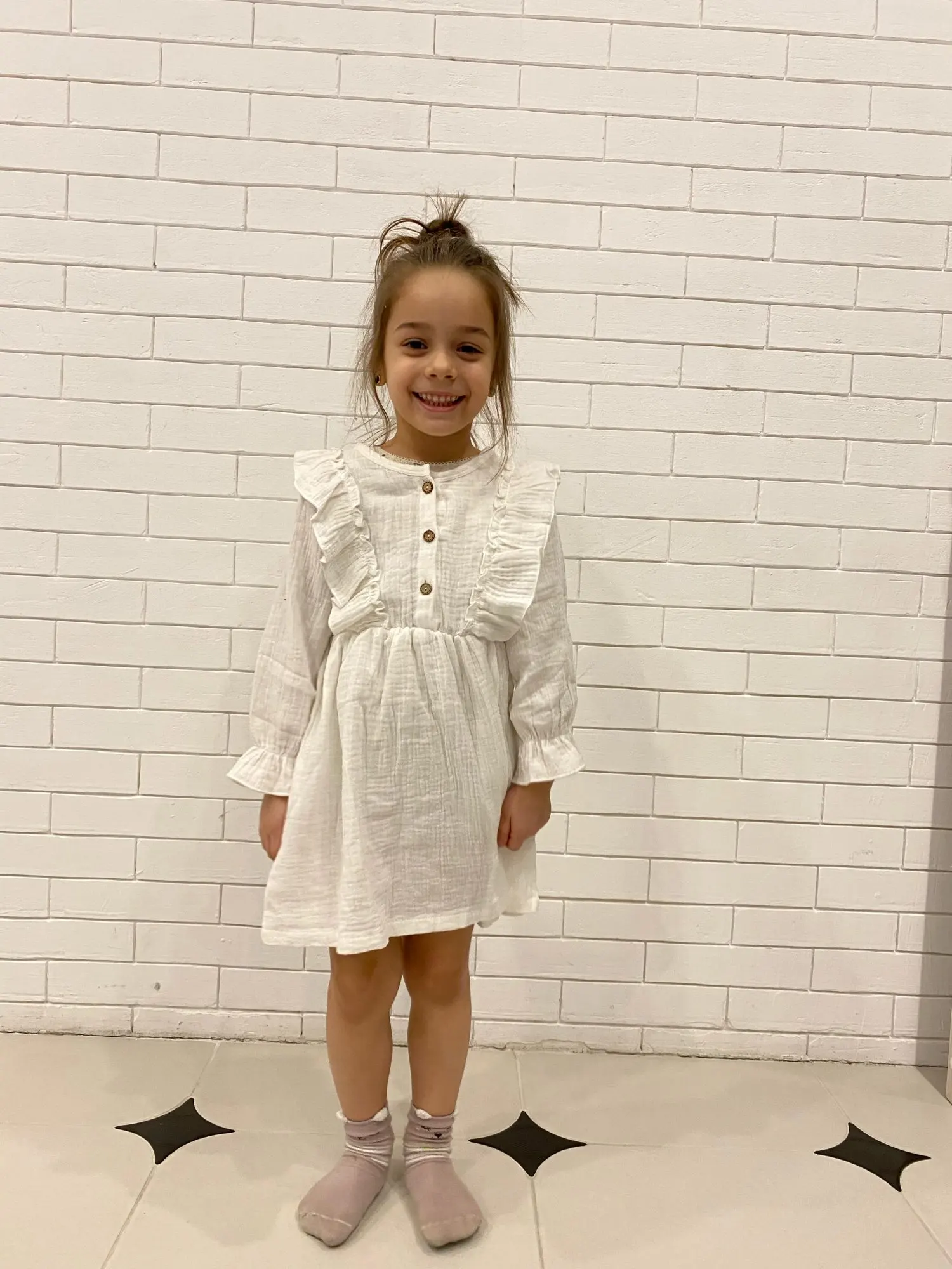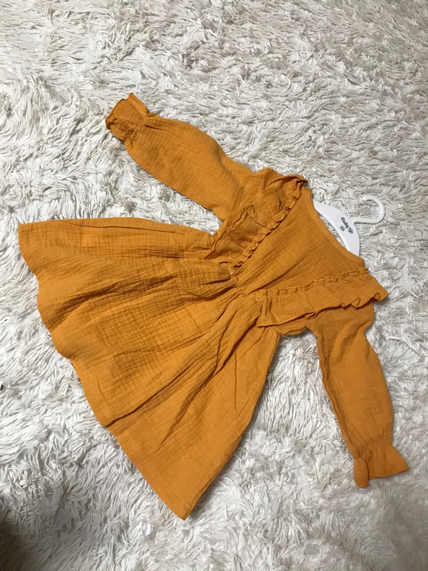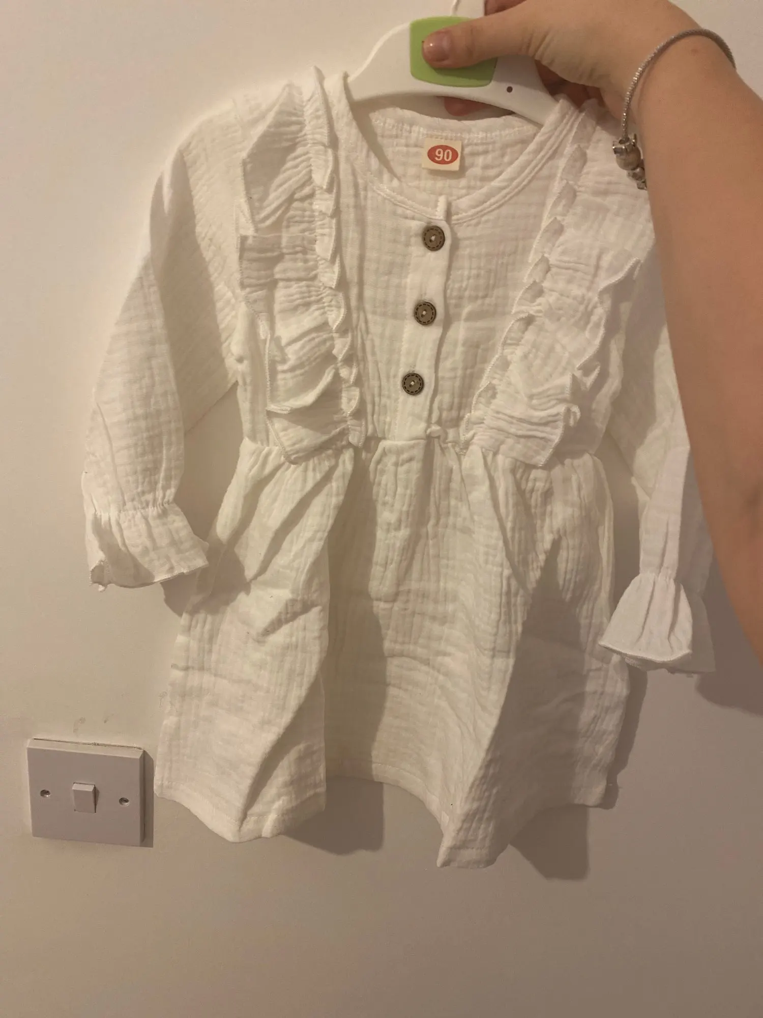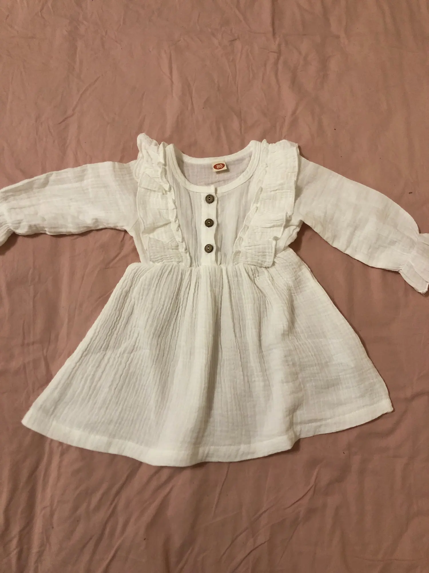Śliczna sukienka. Miły materiał, drewniane guziczki. Rozmiar 1-2y ma nadruk 80. Na moje dziecko noszące rozmiar 80-86 jest idealna.