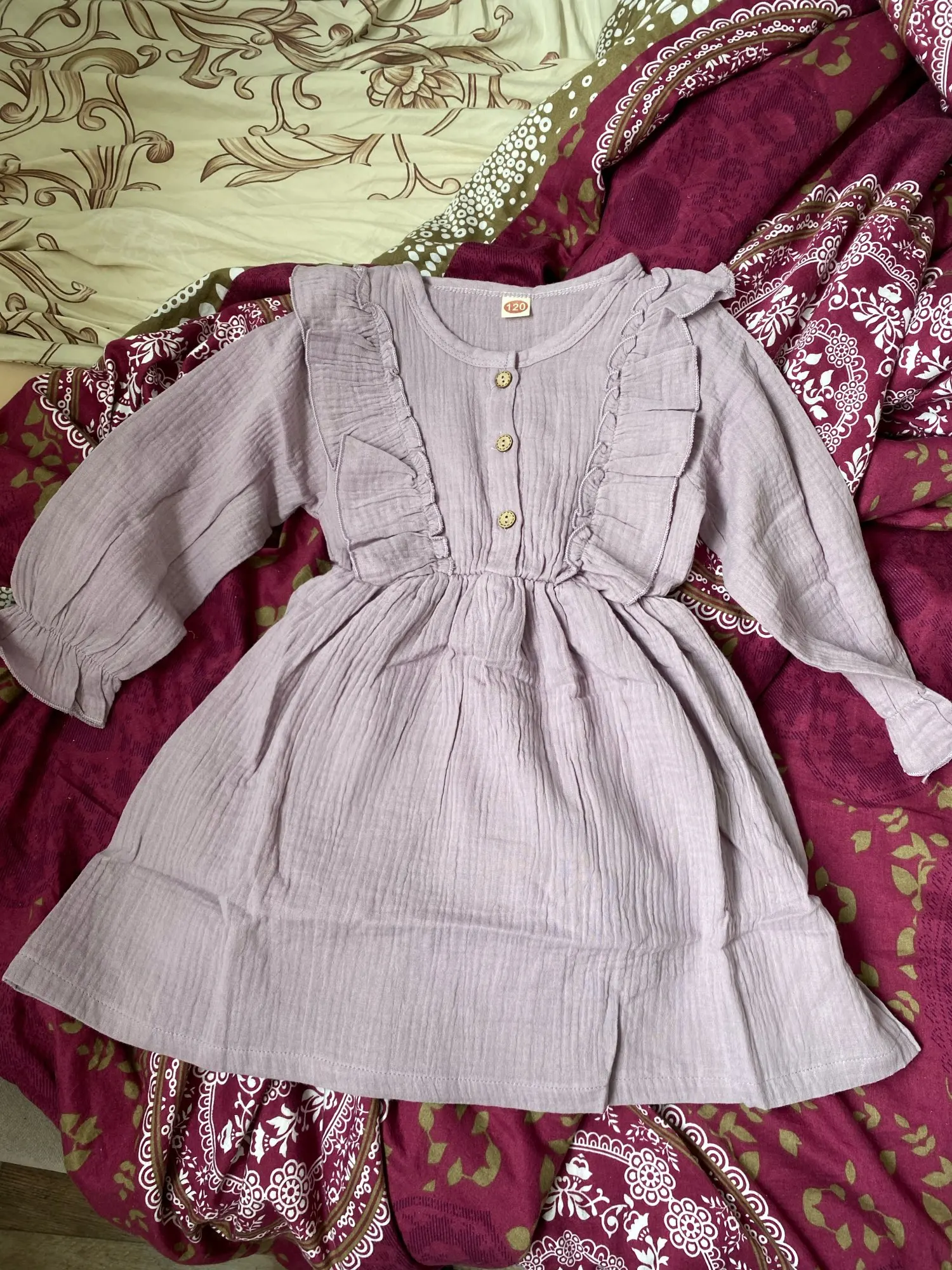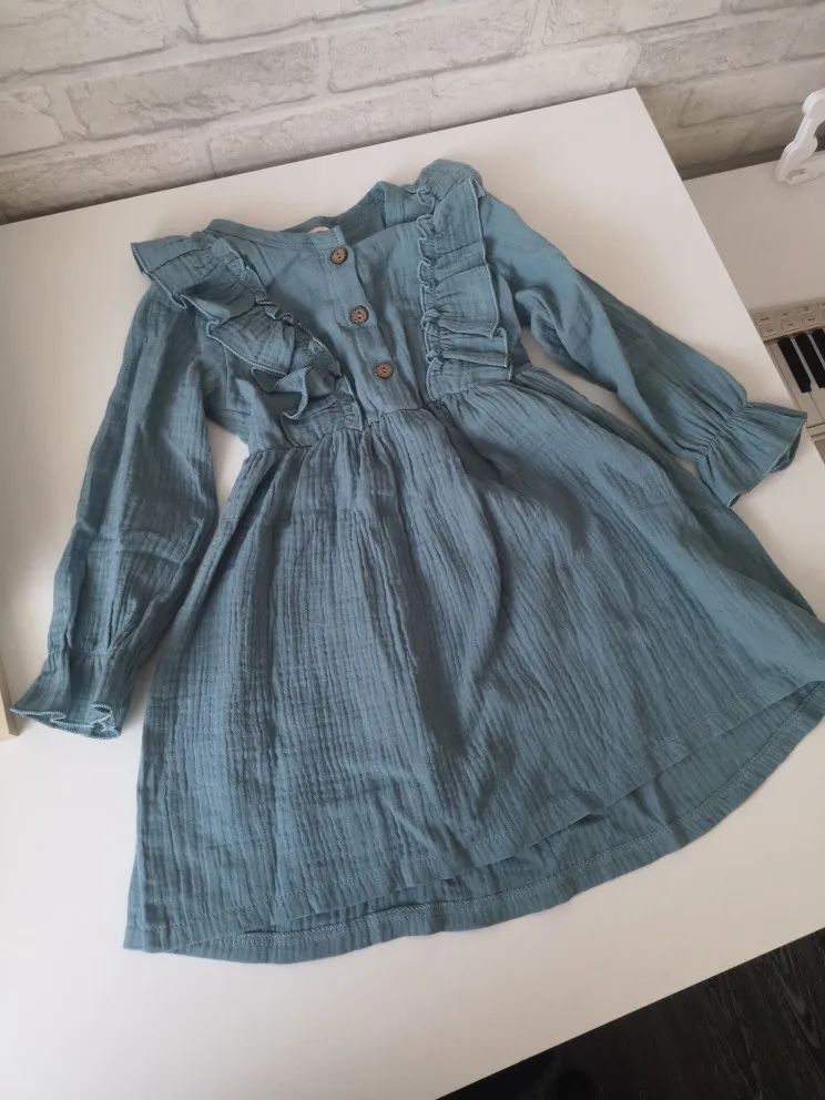 Очень красивое, хлопковое, лёгкое платье. Мне нравиться цвет. Покупала на перёд, на возраст 4-5 лет, пришёл размер 110, я думаю будет хорошо, нам сейчас 2 года и 2 месяца и нам велико. В некоторых местах есть торчящие ниточки, но не страшно, можно обрезать. Доставка была очень быстрой, где-то 11 дней с момента заказа в Латвию.