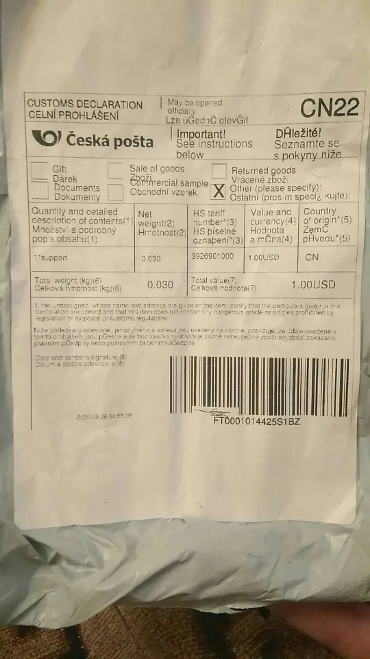 Посылка пришла из Чехии, хотя два месяца числилась, что прибыла в Россию. Далее трек не отслеживался. Пришлось открыть спор. Почти три месяца шло. Похоже китайцы пешком шли через Чехию с моей посылкой. За такую долгую доставку продавцу ставлю 2 звёзды. И за обратную связь тоже. Хоть бы написал, что через границу с Чехией переползал.