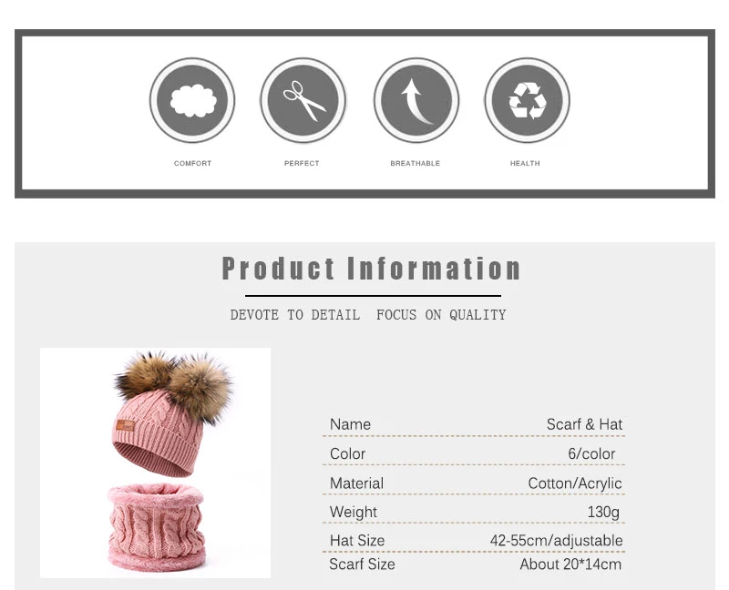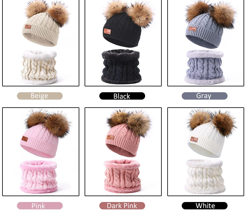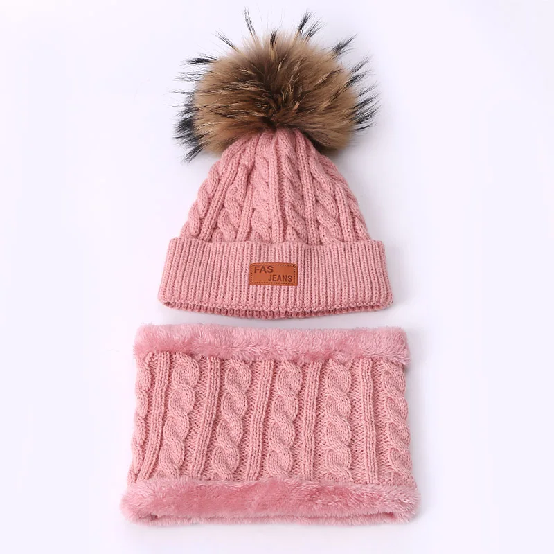 Набор из шапки и шарфа с помпоном из натурального меха, зимние детские однотонные вязаные теплые шапочки, уличная шапочка, шапки, шарф с кольцом, комплект из 2 предметов