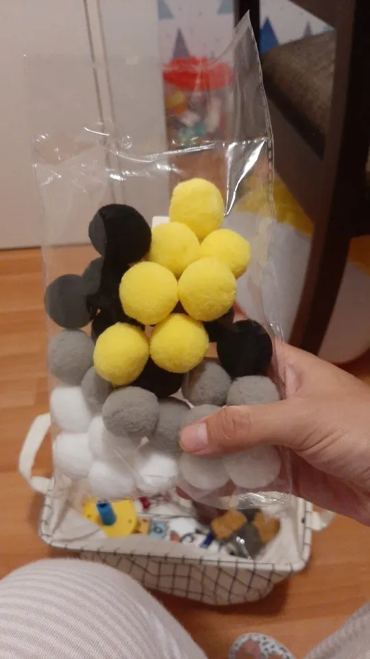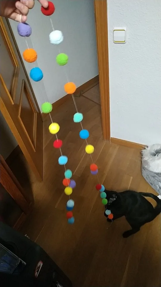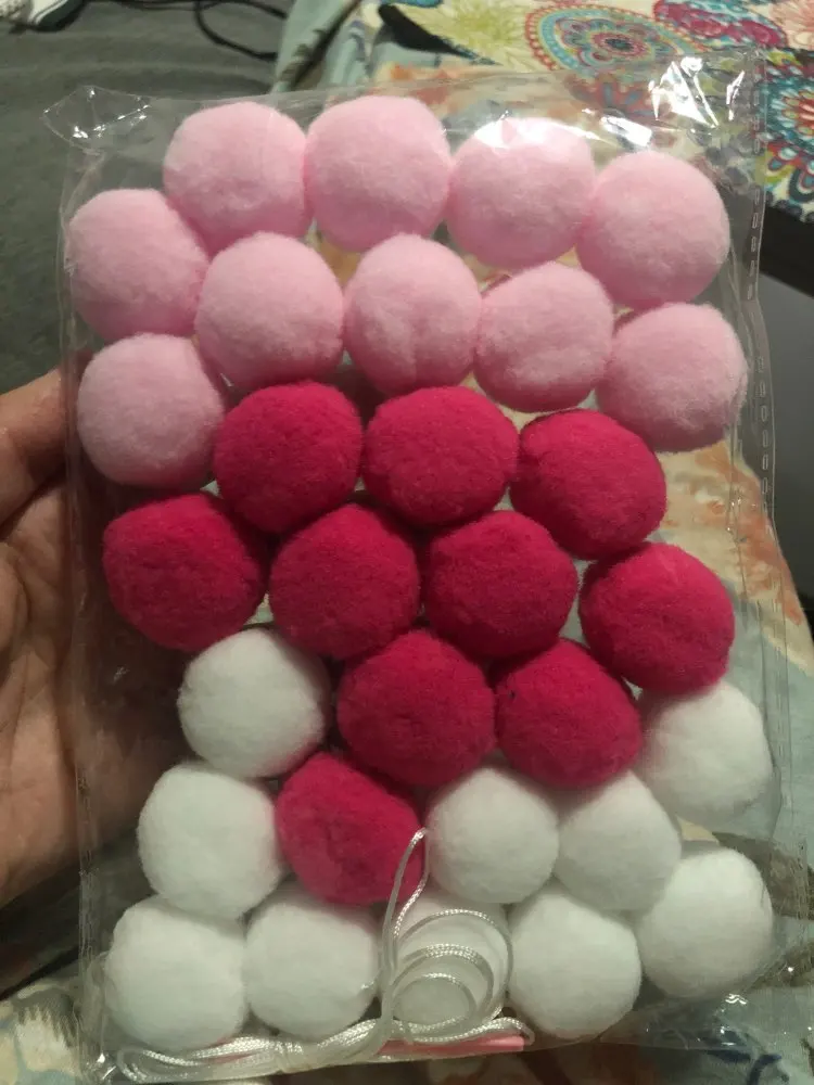 Очень хорошо, но вы должны сделать это самостоятельно, возьмите веревку и иглу (пластик), так что вы собираетесь положить помпоны на веревку.