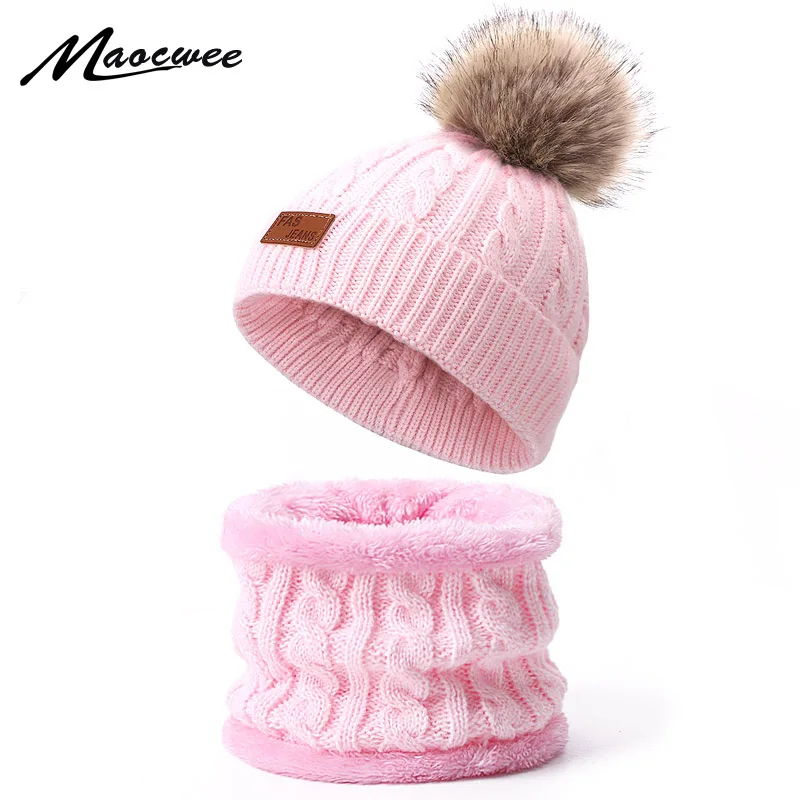 Осенне-зимний комплект из шарфа и кольца Nack для детей с помпоном из искусственного меха Теплый вязаный плотный комплект из шапки и шарфа однотонные детские вязаные шапки