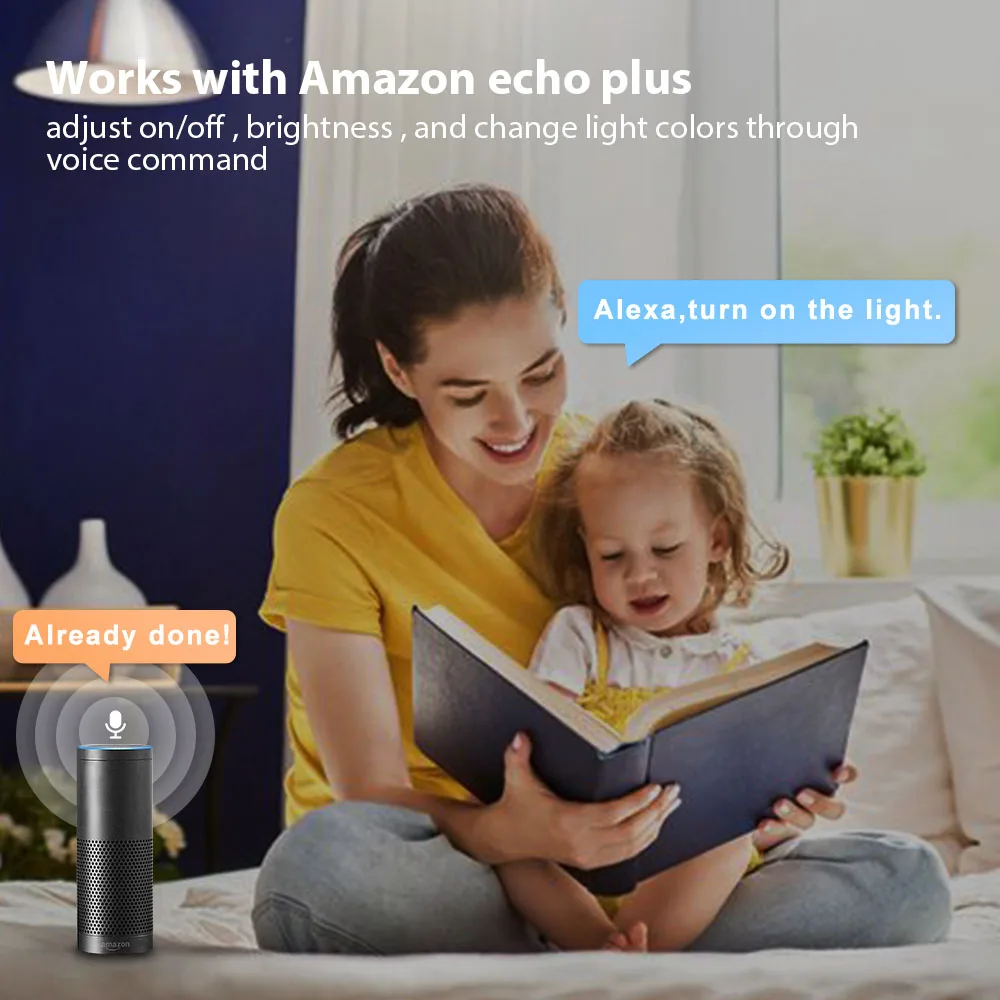 * Голосовое управление: работает с Alexa Echo Plus, голосовое управление вашими светодиодными лампами, разговаривая с Amazon Alexa, вы можете включить/выключить, изменить цвет, тусклый/осветить лампы RGB.